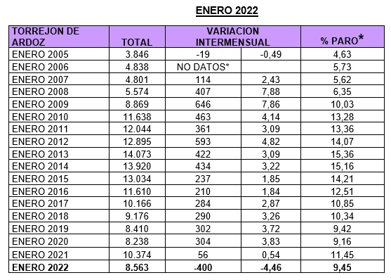 Torrejón de Ardoz, 9 de febrero de 2022. El número de desempleados en el mes de enero fue de 8.563 vecinos, situando la tasa del paro en el 9,45 %. Se da la circunstancia de que en el conjunto de España el paro ha subido en 17.173 personas en este mismo mes de enero.