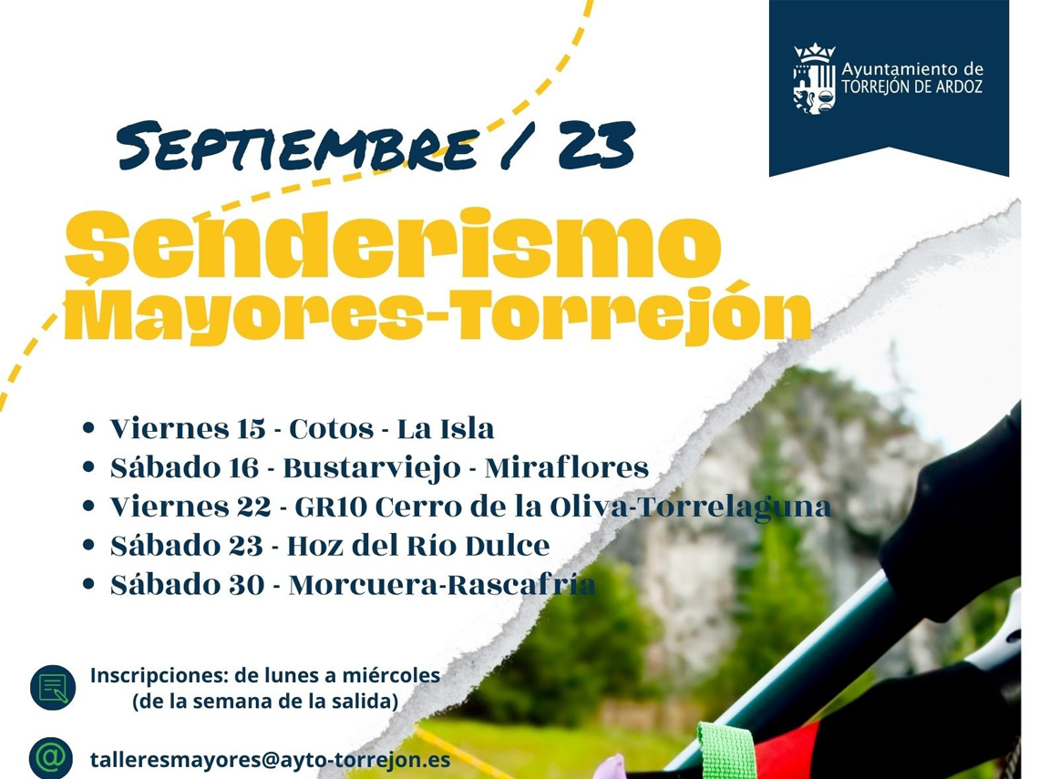 Torrejón de Ardoz, 25 de septiembre de 2023. Por un lado, se oferta senderismo para mayores en este mes de septiembre cuya próxima cita será el sábado 30 a Morcuera- Rascafría. También está abierta la inscripción para las excursiones de un día que el 5 de octubre será a Manzanares el Real y Colmenar Viejo, el 20 de octubre a Segovia y el 17 de diciembre en Aranda de Duero.