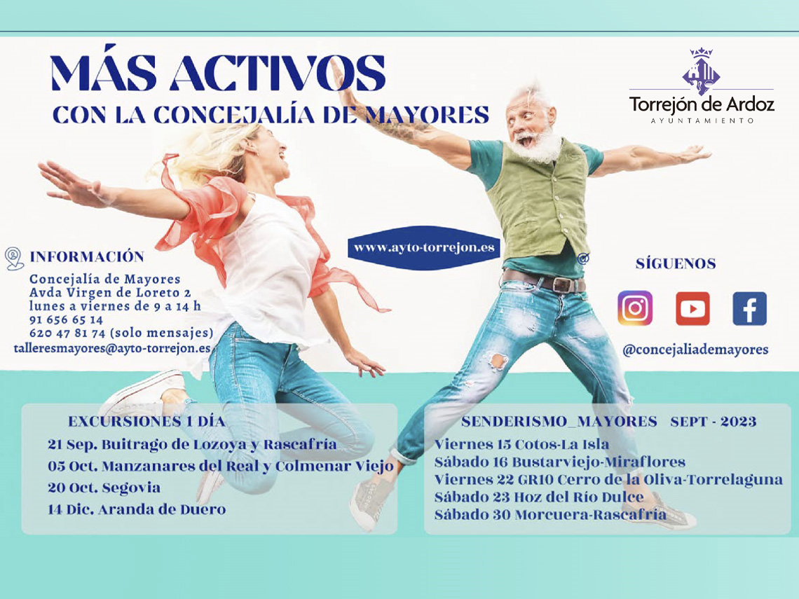 Torrejón de Ardoz, 2 de octubre de 2023. Para más información e inscripciones dirigirse a la Concejalía de Mayores del Ayuntamiento de Torrejón de Ardoz, situada en la avenida Virgen de Loreto 2, en el teléfono 91 656 65 14 o 620 47 81 74 (sólo mensajes) y a través del e-mail: talleresmayores@ayto-torrejon.es.