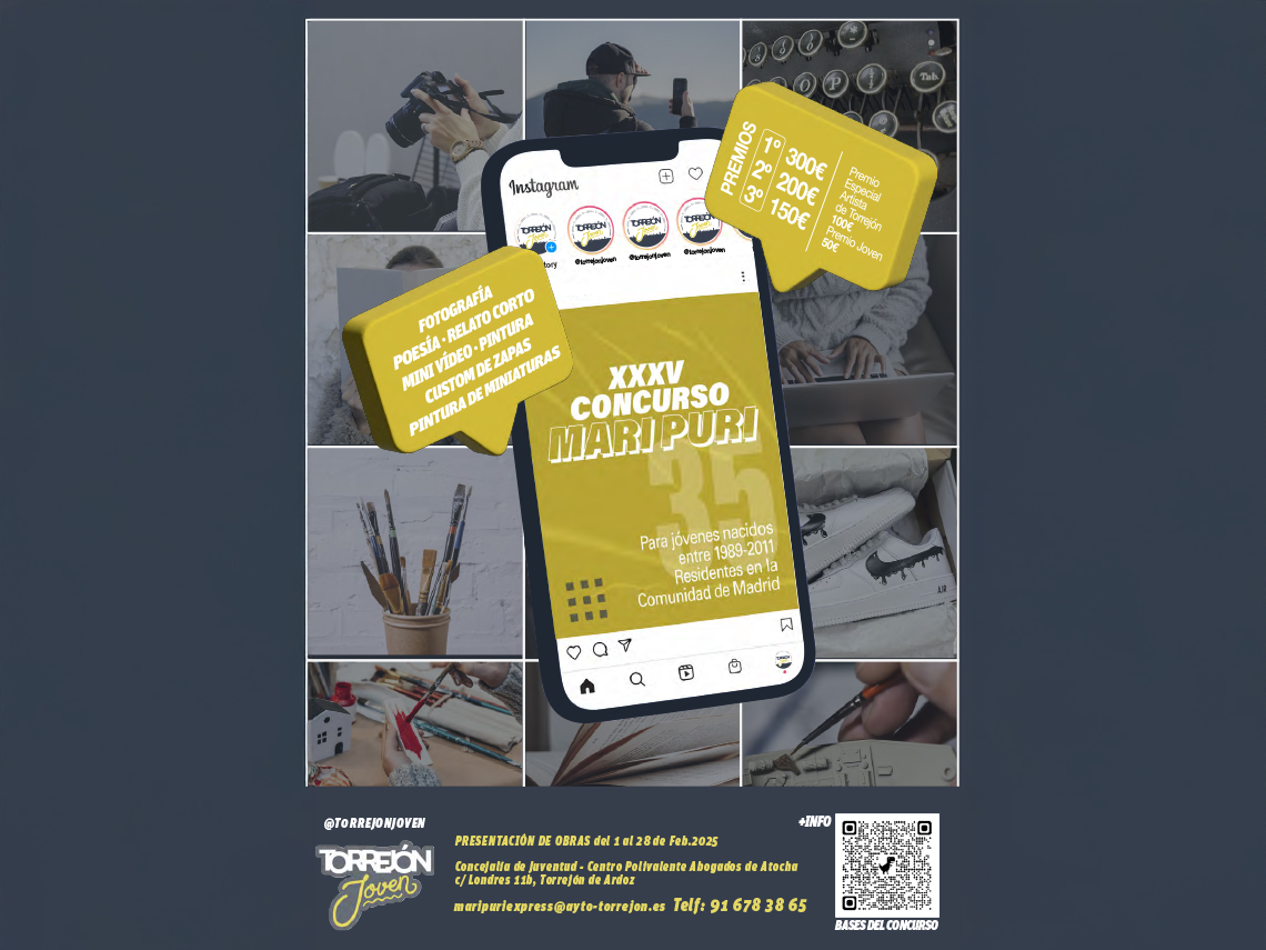 Torrejón de Ardoz, 20 de febrero de 2025. Para los jóvenes más creativos, llega una nueva edición de uno de los certámenes con más solera en la ciudad, el XXXV Concurso Mari Puri Express, abierto a todos los residentes en la Comunidad de nacidos entre 1989 y 2011. Por cada modalidad se establece un primer premio de 300 euros, un segundo de 200 euros y un tercero de 150 euros. Además, como medida de apoyo a los jóvenes artistas locales, está el “Premio Especial Artista de Torrejón” dotado con 100 euros. Asimismo, para fomentar a los artistas más jóvenes de Torrejón hay un “Premio Joven” dotado con 50 euros.