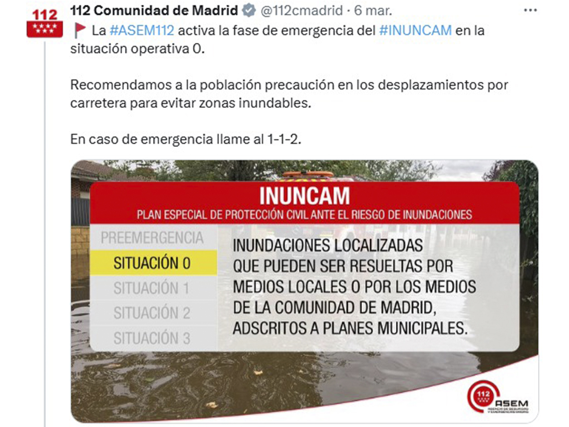 Ante la Alerta por lluvias persistentes en la Comunidad de Madrid, desde el Ayuntamiento de Torrejón de Ardoz se recomienda evitar las zonas próximas a la ribera del Río Henares. La Agencia de Seguridad y Emergencias de la Comunidad de Madrid (ASEM 112) ha activado la fase 0, nivel más bajo de emergencia, del Plan INUNCAM que tiene como objetivo hacer frente a todas aquellas situaciones de emergencia por riesgo de inundaciones.