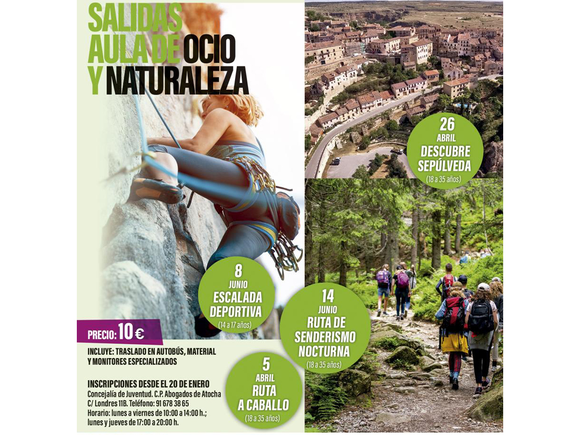 • Por otra parte, todavía quedan plazas libres para las actividades al aire libre del “Aula de ocio y naturaleza” de Descubre Sepúlveda (26 de abril) y Ruta de senderismo nocturno (14 de junio) para jóvenes de 18 a 35 años y Escalada deportiva (8 de junio) para los jóvenes de 14 a 17 años. Todas las excursiones tienen un precio de 10 euros e incluyen traslado en autobús, material y monitores especializados