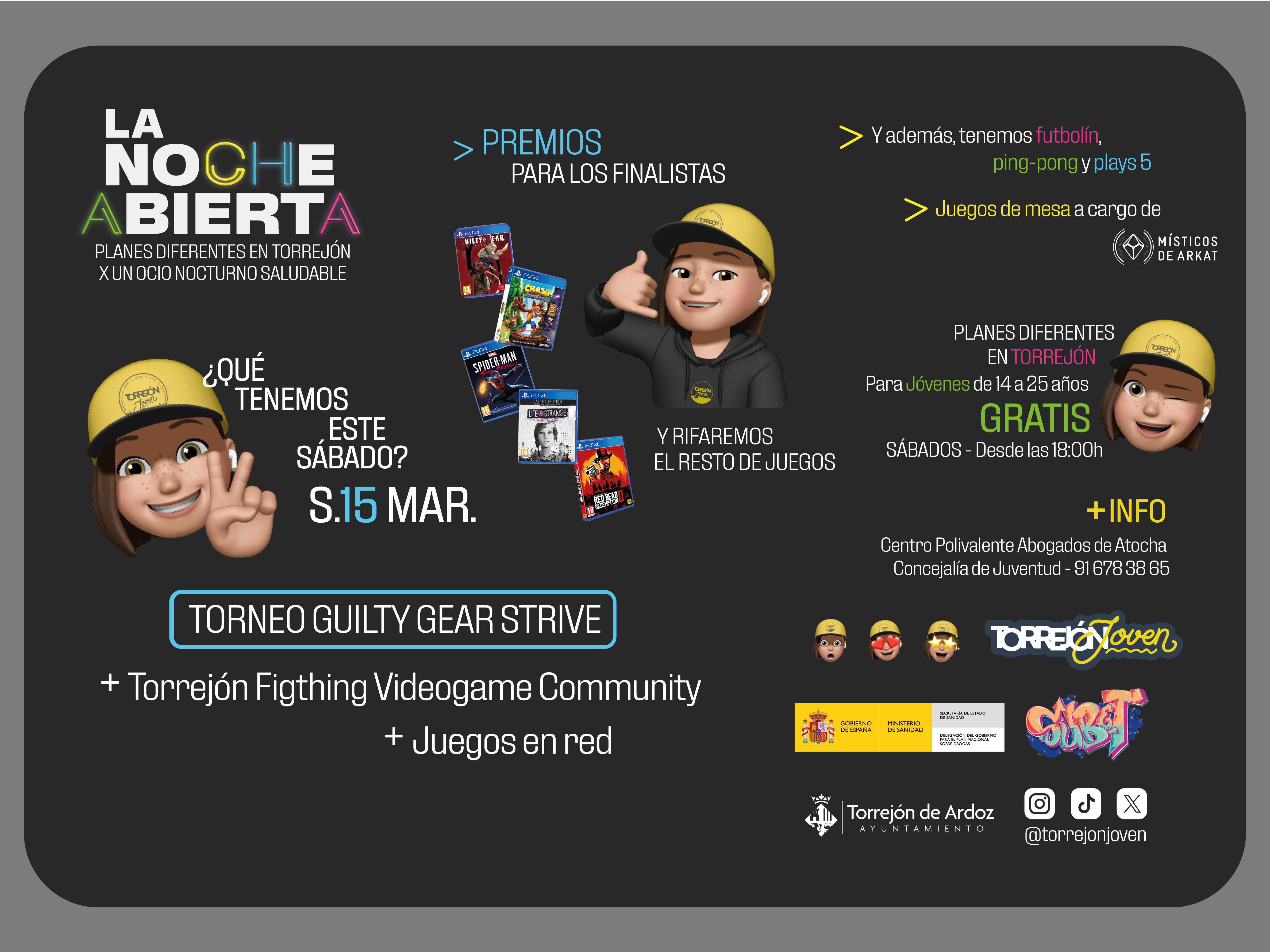 Que comience la batalla. La Noche Abierta de mañana sábado, 15 de marzo traerá combates épicos con un emocionante torneo Guilty Gear Strive. No importa si eres un jugador experimentado o un novato que busca iniciarse en el mundo de los juegos de lucha. Ven a disfrutar de una noche llena de adrenalina, risas y, sobre todo, mucha diversión, donde los participantes demostrarán sus habilidades y buscarán la gloria. Las inscripciones se podrán realizar de 18:00 a 19:00 horas y habrá premios para el primer, segundo y tercer clasificado y sorteo entre los participantes. Además, simultáneamente habrá juegos en red y el Torrejón Fighting Videogame Comunity.