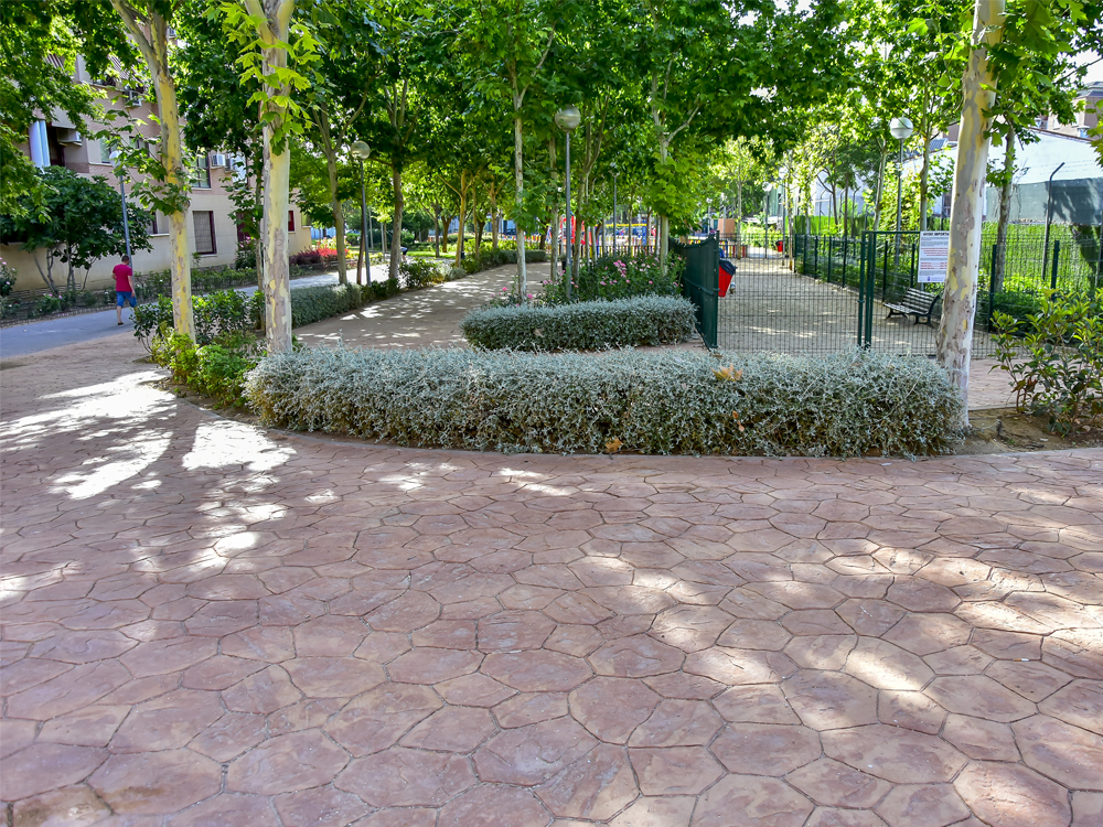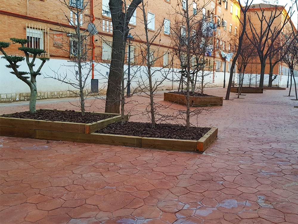 • En la mayoría de las actuaciones realizadas, los trabajos se han centrado en sustituir zonas terrizas por pavimento impreso de color, para evitar así los encharcamientos que se producen con las lluvias, potenciar con nuevas plantaciones su vegetación e instalar riego por goteo para facilitar el mantenimiento