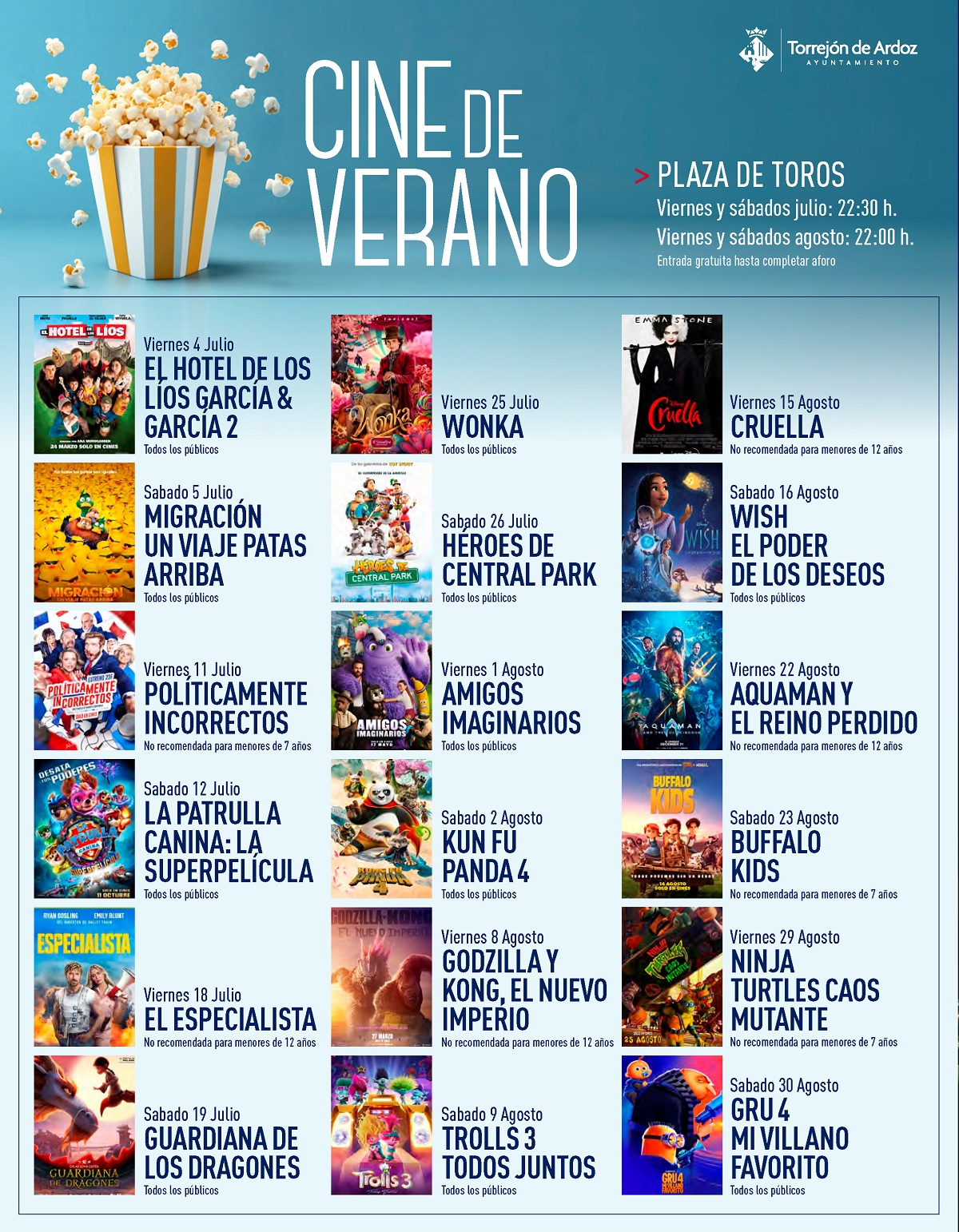 “Una de las citas más tradicionales en nuestra ciudad es el Cine de Verano. No hay nada más veraniego en Torrejón que tomar el bocadillo y un refresco, disfrutando de una de las últimas películas de éxito. Para ello la Plaza de Toros se llenará de las estrellas del séptimo arte con una programación seleccionada para todos los gustos y edades. Pueden acudir todas aquellas personas que lo deseen hasta completar aforo”, recordó el alcalde Alejandro Navarro.