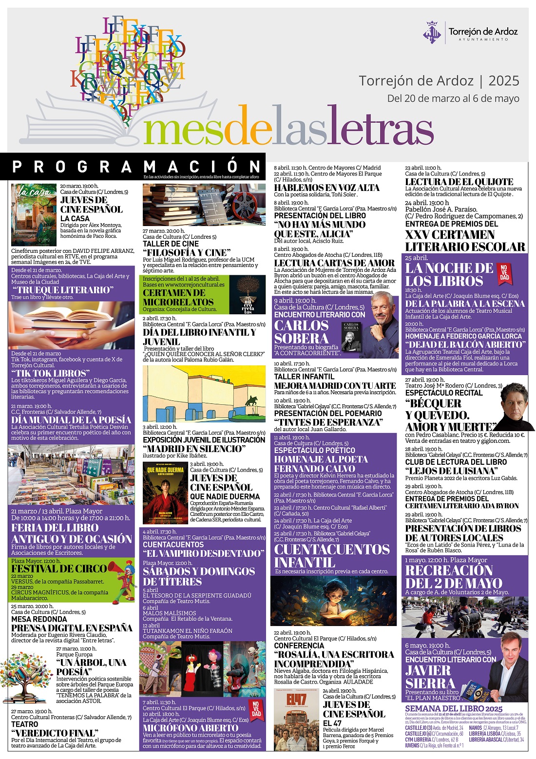 Asimismo, hay que destacar la lectura continuada de El Quijote que organiza la Asociación Atenea el 23 de abril a partir de las 11:00 horas, en la Casa de la Cultura y otras novedades, como “Tik Tok Libros”, donde los tiktokeros torrejoneros, Miguel Aguilera y Diego García, entrevistarán a usuarios de las bibliotecas y preguntarán recomendaciones literarias. Además, el 27 de marzo habrá una intervención poética titulada “Un Árbol, Un Poema” en el Parque Europa, a cargo del taller de poesía “Tenemos la palabra” de la Asociación ASTOR y por parte de la Asociación de Mujeres Ada Byron será la Lectura de cartas de amor, cartas que los torrejoneros han ido depositando en el buzón del amor en el hall del Centro Polivalente Abogados de Atocha, y que van dirigidas a parejas, padres, abuelos, mascotas, al amor en general.