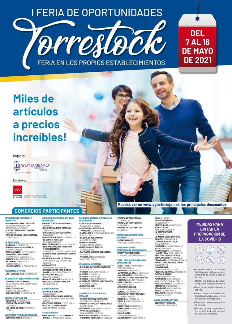 Último fin de semana para poder disfrutar de la I Feria de Oportunidades “Torrestock”, que se celebrará en Torrejón de Ardoz hasta el próximo 16 de mayo con importantes descuentos y ofertas en más de 100 comercios. Gracias a esta iniciativa, los vecinos pueden disfrutar de grandes promociones y rebajas en los más de 100 comercios participantes en el horario comercial de cada establecimiento.