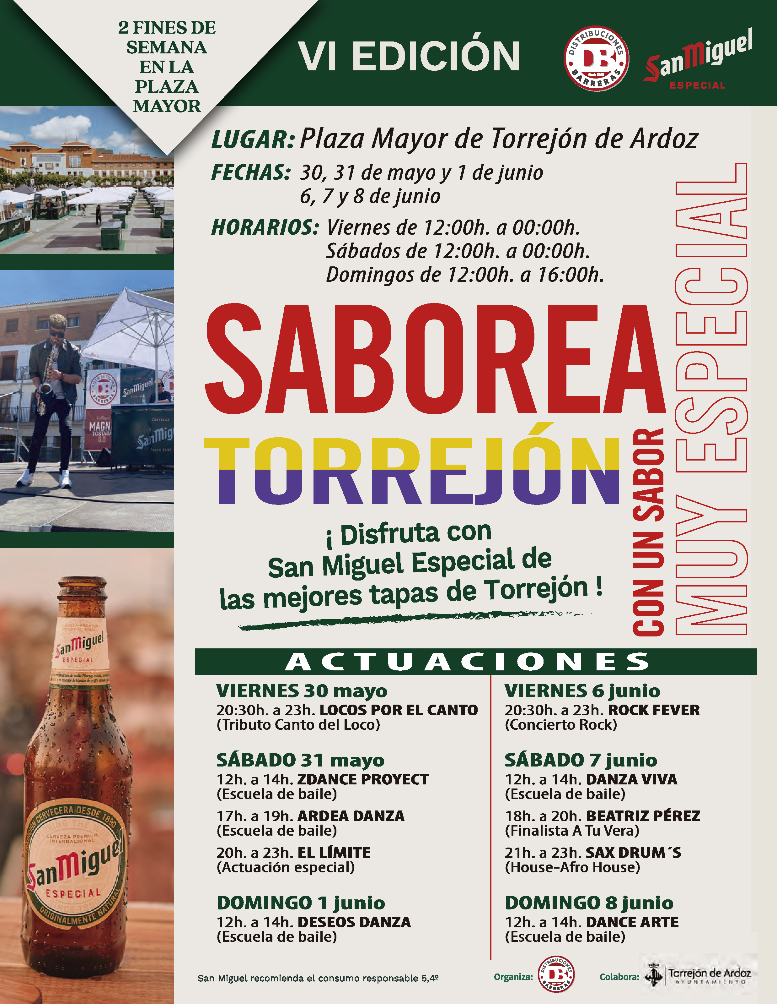 Llega otro fin de semana lleno de sabor y diversión en la Plaza Mayor de la ciudad con Saborea Torrejón, donde se podrá disfrutar de una gran variedad de tapas elaboradas por varios establecimientos de la localidad, cerveza y buena música en directo y el mejor ambiente. Se celebrará hoy, viernes 6, y mañana, sábado 7, de 12:00 a 00:00 horas y el domingo, 8 de junio de 12:00 a 16:00 horas. El plan perfecto para compartir con amigos y familia, convirtiéndose en una cita imprescindible en el calendario de ocio de los vecinos.