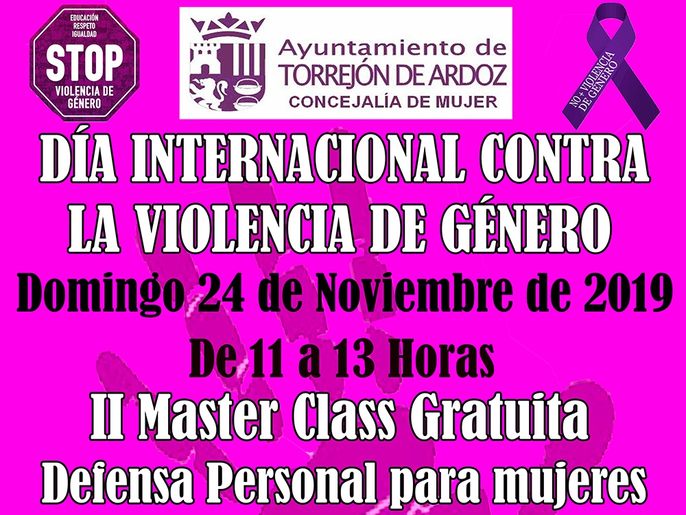 • Además, el 24 de noviembre de 11:00 a 13:00 horas en el Pabellón José Antonio Paraíso será el turno de una Master Class de Defesa Personal gratuita, impartida por la tricampeona mundial, Cristina Álvarez. Las inscripciones podrán realizarse hasta el 22 de noviembre en el Centro Polivalente Abogados o a través del correo concejaliamujer@ayto-torrejon.es