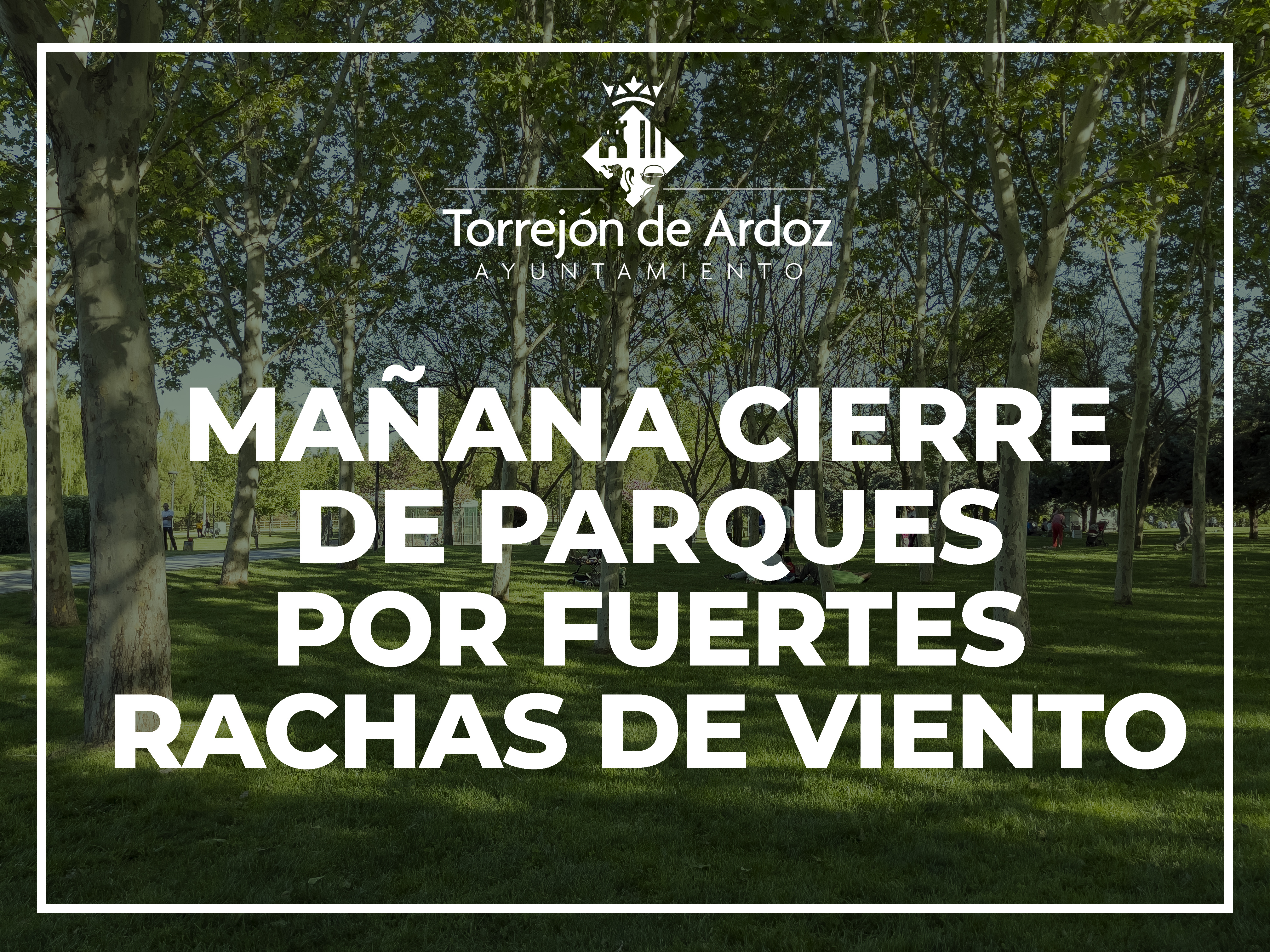 Debido al aviso por fuertes rachas de viento previstas para mañana, jueves, 5 de febrero, por la Agencia Estatal de Meteorología, se cierran todos los parques de Torrejón de Ardoz. Además, recomendamos evitar pasear por zonas arboladas, y bajo cornisas, balcones, ventanas y muros, así como recoger los toldos, retirar de ventanas y balcones objetos que puedan caer por efecto del viento.