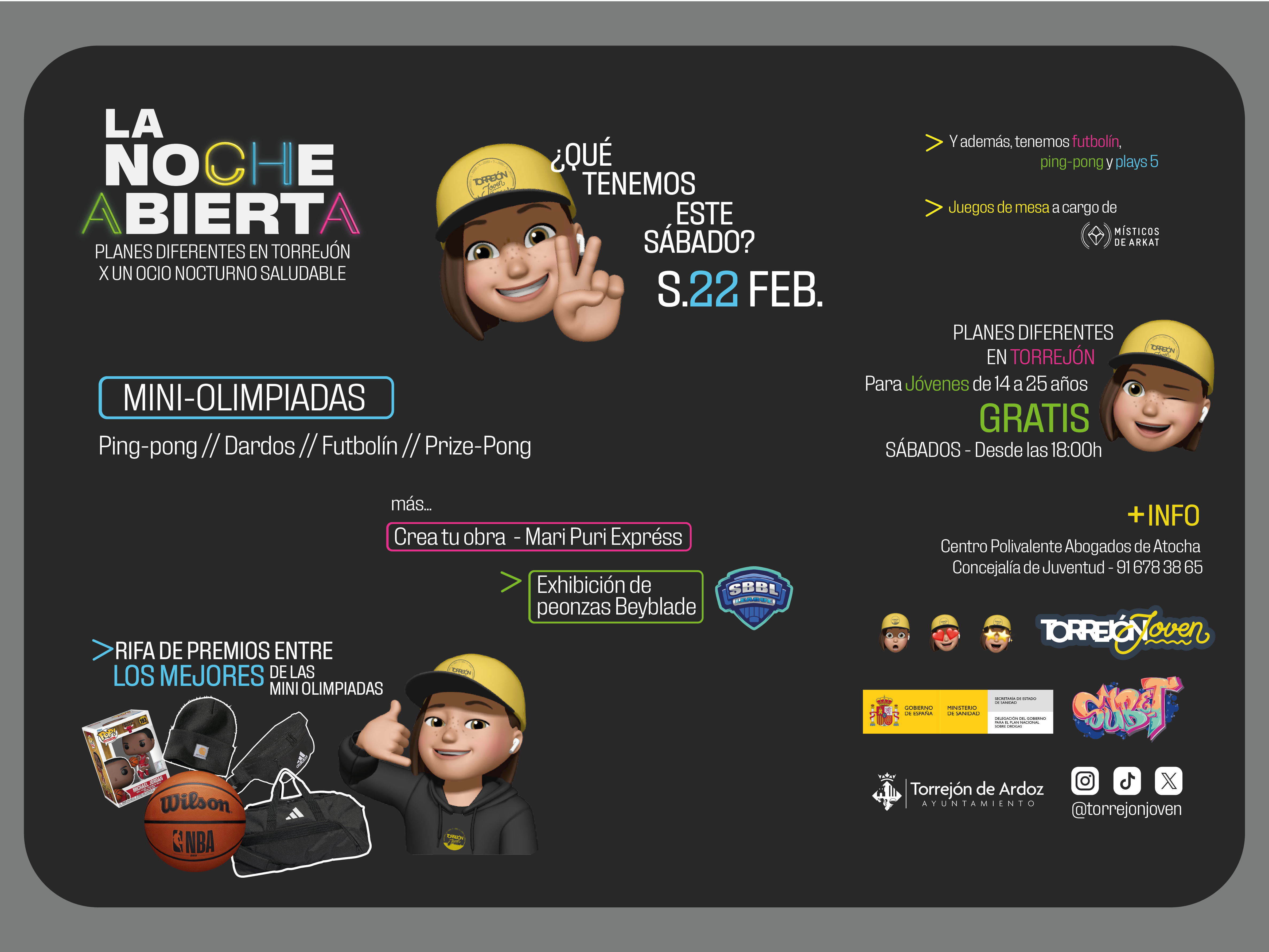 • La Noche Abierta de mañana sábado, 22 de febrero, llega con unas mini olimpiadas, donde los participantes podrán demostrar sus habilidades en una serie de divertidos desafíos deportivos, como ping pong, futbolín, dardos o Price-pong. Habrá premios para el primer, segundo y tercer ganador. Además, se realizará una rifa con una gran variedad de sorpresas. Y para completar la jornada, habrá una exhibición de peonzas, Beyblade a cargo de SBBL