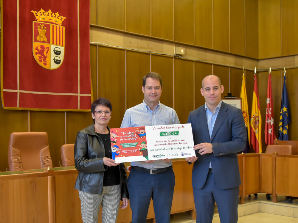 El Alcalde de Torrejón de Ardoz, Ignacio Vázquez, y el gerente de Ecovidrio de la Comunidad de Madrid, Ricardo Sevilla, han entregado esta mañana a la presidenta de la Asociación de Familiares de Enfermos de Alzheimer de Torrejón de Ardoz (Torrafal), María Guerrero, un cheque por importe de 1.000 euros procedentes de la campaña que Ecovidrio y el Consistorio torrejonero lanzaron bajo el lema “Tu vidrio se convertirá en recuerdos”, encaminada a promover el reciclaje de envases de vidrio entre todos los vecinos y vecinas de la ciudad con este fin solidario. La iniciativa, que se desarrolló entre el 20 de diciembre y el 7 de enero pasados, invitaba a todos los ciudadanos y visitantes de la ciudad a reciclar los residuos de envases de vidrio durante las Mágicas Navidades. Para ello, Ecovidrio colocó 6 contenedores decorados con la imagen de los Guachis en diferentes zonas del municipio.