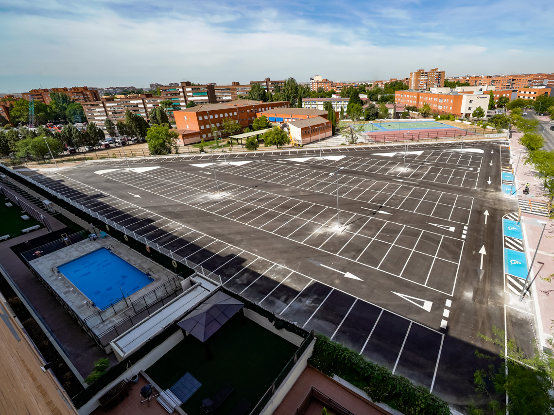 Torrejón de Ardoz, 3 de septiembre de 2025. El aparcamiento tiene firme de aglomerado asfáltico, así como la señalización horizontal necesaria y sumideros para recogida de aguas pluviales y alumbrado público constituido por 19 nuevas luminarias.