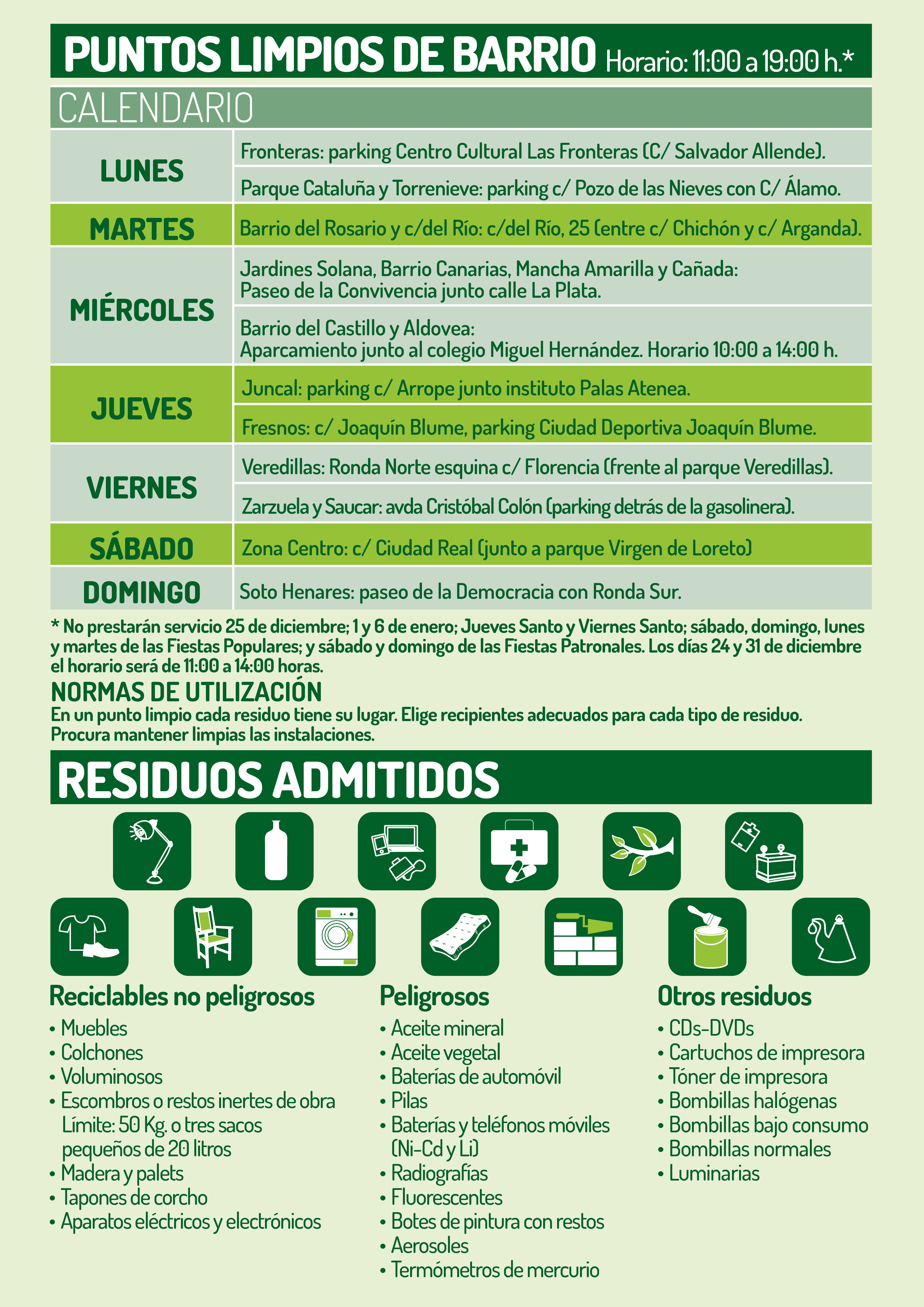 • Entre ellos, hay uno nuevo que se sitúa los miércoles de 10:00 a 14:00 horas en el aparcamiento junto al colegio Miguel Hernández, en el barrio del Castillo y junto al nuevo barrio de Aldovea. Los otros 10 funcionan de 11:00 a 19:00 horas. Además, los días 25 de diciembre, 1 y 6 de enero, Jueves Santo y Viernes Santo, sábado, domingo, lunes y martes de las Fiestas Populares, sábado y domingo de las Fiestas Patronales y el 12 de octubre, no se prestará el servicio de los Puntos Limpios de Barrio. Los días 24 y 31 de diciembre el horario será de 11:00 a 14:00 horas