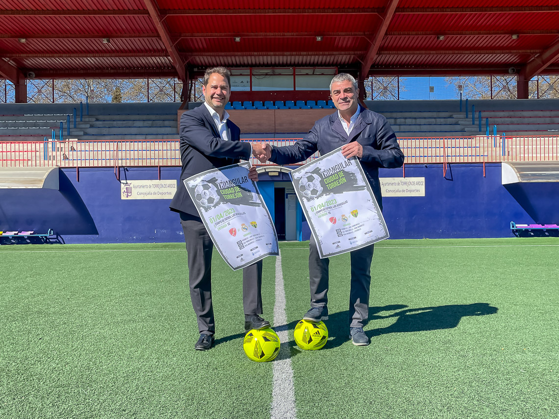 El Campo de Fútbol Municipal Las Veredillas acogerá este sábado, 1 de abril, el torneo “Triangular Ciudad de Torrejón” de categoría infantil entre los equipos del Real Madrid, AD Torrejón CF y Periso. El evento se ha presentado esta mañana y ha contado con la presencia del alcalde Ignacio Vázquez, del exjugador del Real Madrid y organizador del torneo, Manolo Sanchís.