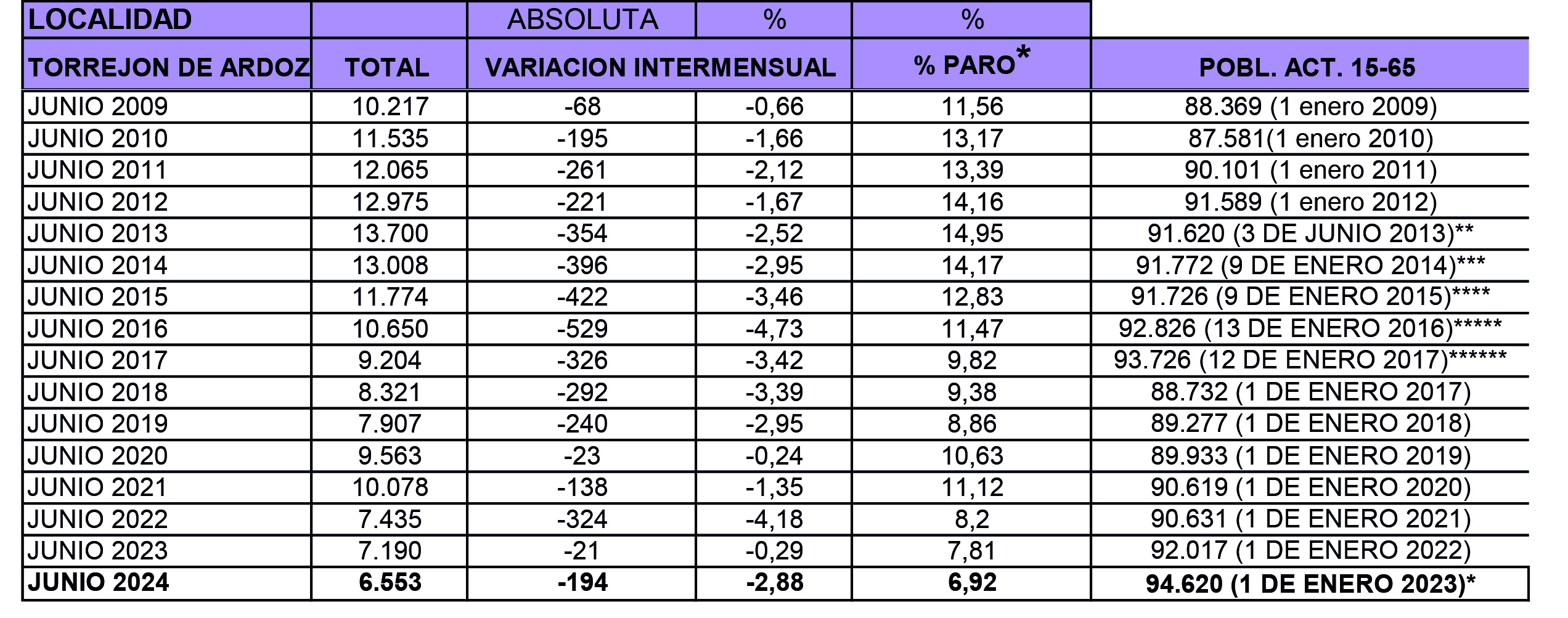 Torrejón de Ardoz, 2 de julio de 2024. Torrejón tiene en estos momentos 6.553 personas desempleadas frente a las 13.700 que tenía en junio de 2013, reduciéndose así más de la mitad el número de desempleados en la ciudad. El paro en Torrejón de Ardoz descendió en 194 personas con la menor tasa de desempleo desde hace 16 años, situándose en el 6,92%.
