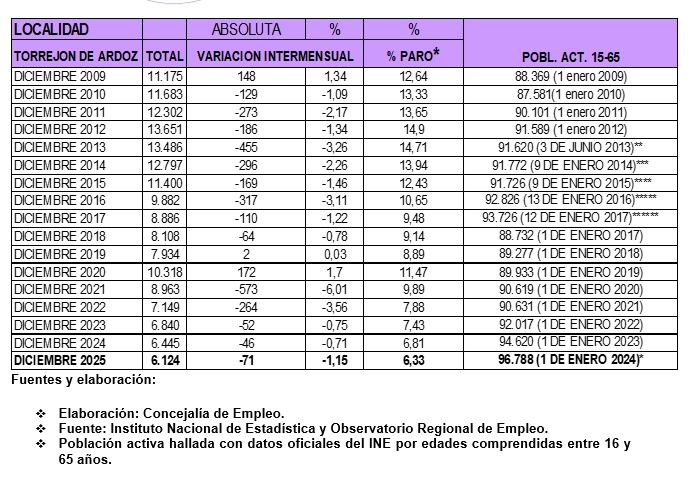 Torrejón de Ardoz, 8 de enero de 2026. Torrejón ha terminado el mes de diciembre de 2025 con un total de 6.124 personas desempleadas, frente a las 13.486 que tenía en diciembre de 2013, reduciéndose a más de la mitad el número de desempleados en la ciudad.