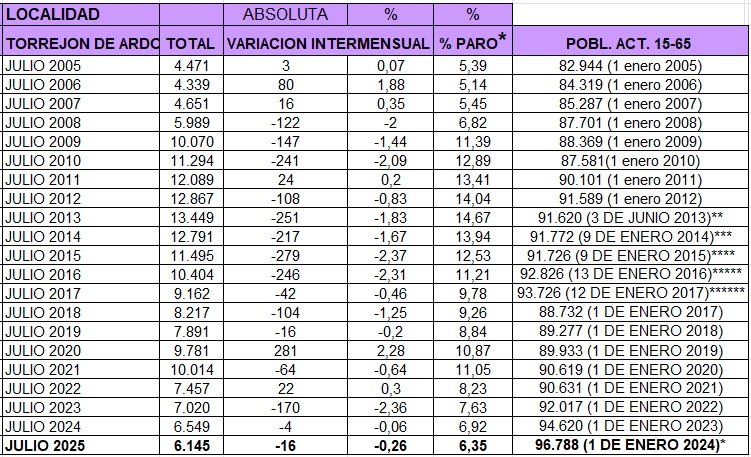 Torrejón de Ardoz, 4 de agosto de 2025. Torrejón ha terminado el mes de julio de este año con un total de 6.145 personas desempleadas, frente a las 13.449 que tenía en julio de 2013, reduciéndose a más de la mitad el número de desempleados en la ciudad.