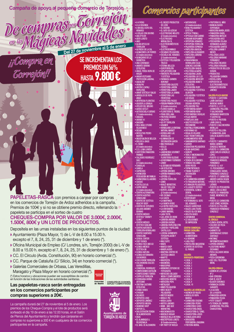 • Además, existen un total de 20 rascas con premios directos de 100 euros que podrán ser canjeados por el ganador en uno de los establecimientos adscritos a la campaña. Es requisito indispensable que el rasca esté debidamente cumplimentado con todos los datos requeridos. Los premios podrán canjearse en compras (no superiores a 300 euros por comercio), en cualquiera de los establecimientos inscritos en la campaña”. El ganador del premio presentará dicho rasca en la Concejalía de Empleo del Ayuntamiento de Torrejón de Ardoz (c/ Londres, s/n, Torrejón 2000 de 8:00 a 15:00 horas) antes del 15 de enero de 2021