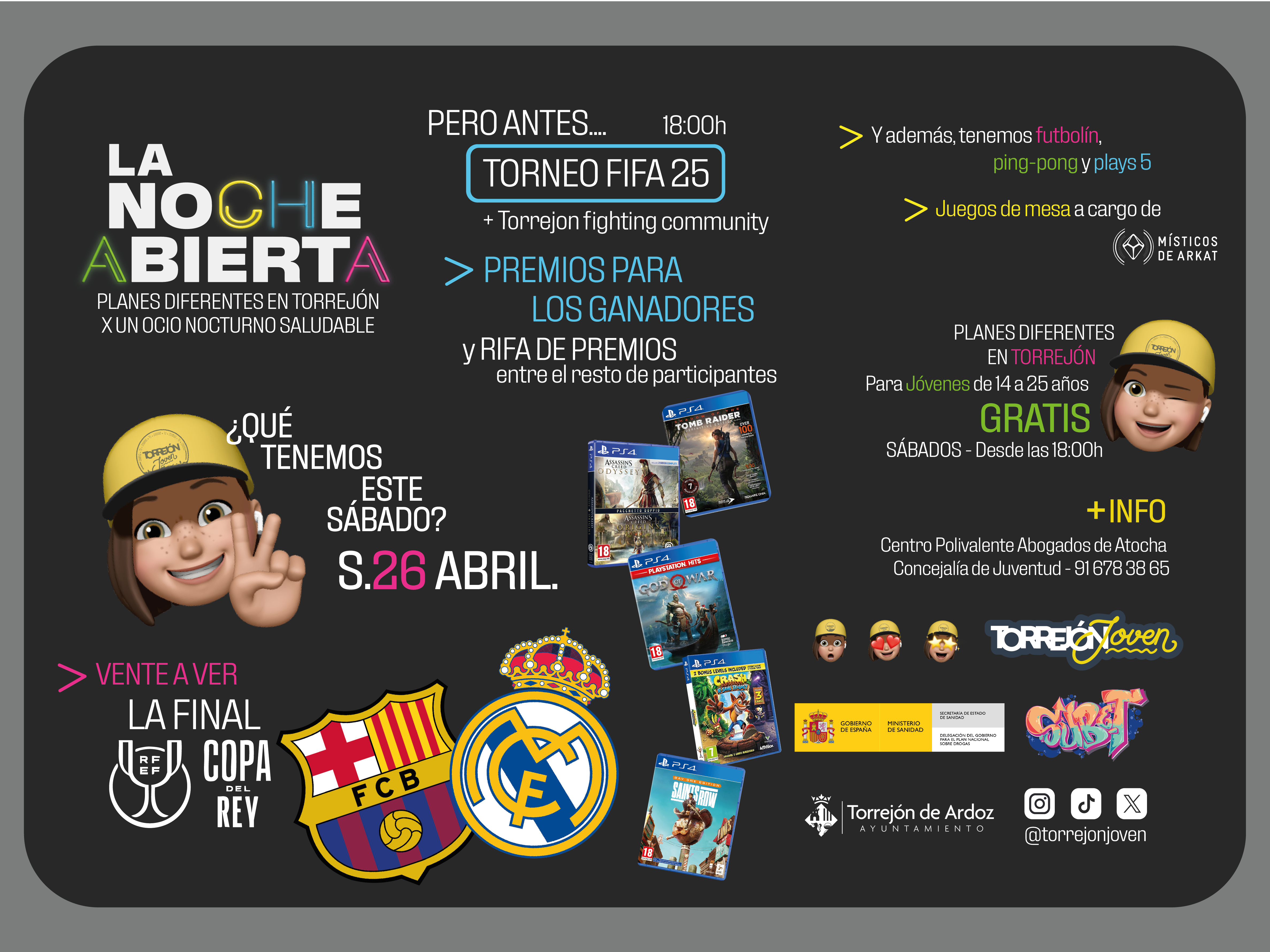 El FIFA 25 se cuela en la programación de la Noche Abierta de mañana sábado, 26 de abril, para hacer las delicias de sus seguidores. Un plan perfecto para quedar con los amigos y competir en el videojuego más popular. Las inscripciones para el torneo podrán realizarse de 18:00 a 19:00 horas en el Centro Polivalente Abogados de Atocha, donde también se podrá disfrutar de futbolín, ping-pong, plays 5 y juegos de mesa a cargo de la Asociación Juvenil Místicos de Arkat. Además, simultáneamente se celebrarán partidas de videojuegos de lucha con Torrejón Fighting Videogame Community y juegos en red y habrá premios para los ganadores y sorteos entre los participantes. Pero eso no es todo. También, se proyectará el partido de la final de la Copa del Rey entre el Real Madrid y Barcelona, a las 22:00 horas, que además estará acompañado de sabrosa pizza para hacer aún más amena la velada. Y aún hay más. Podrás demostrar los que sabes en un Kahoot sobre videojuegos, retando a tus amigos y que gane el mejor.