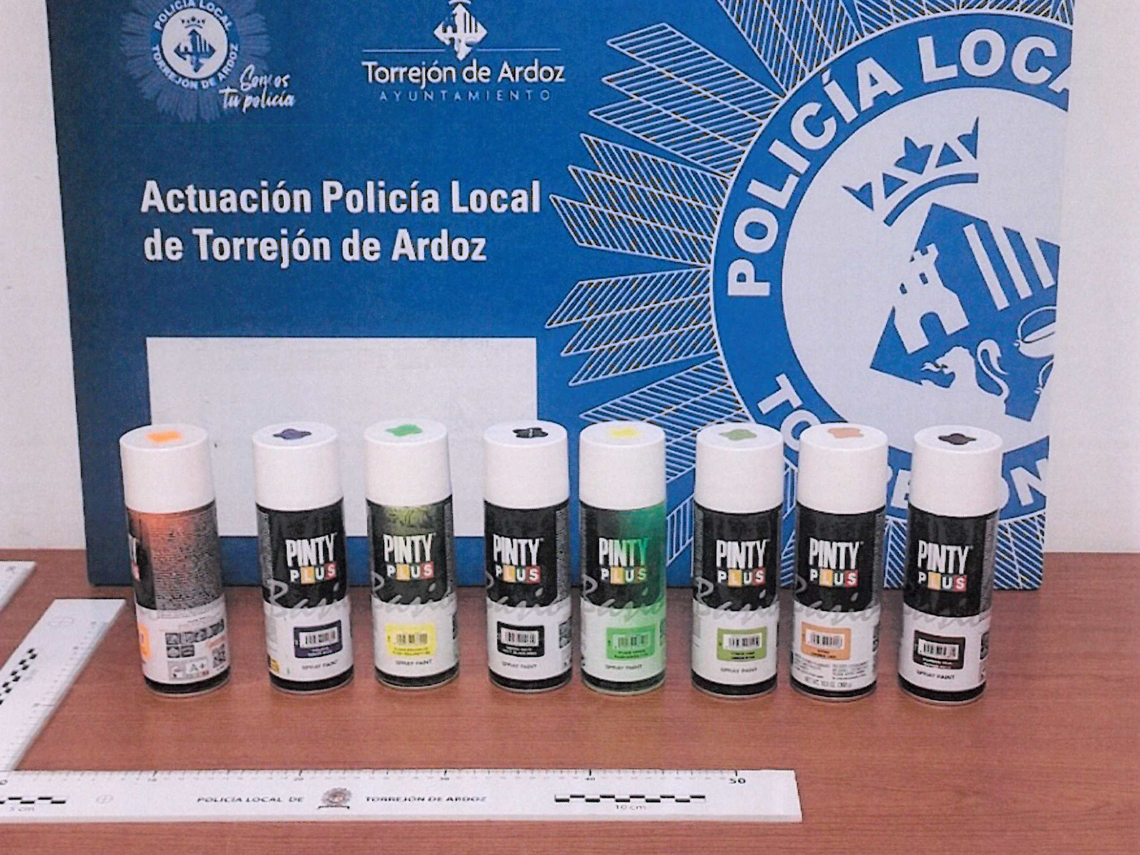 En los últimos meses, la Policía Local de Torrejón de Ardoz ha intervenido material para la realización de pintadas y denunciado a 8 individuos por ensuciar espacios públicos de manera reincidente