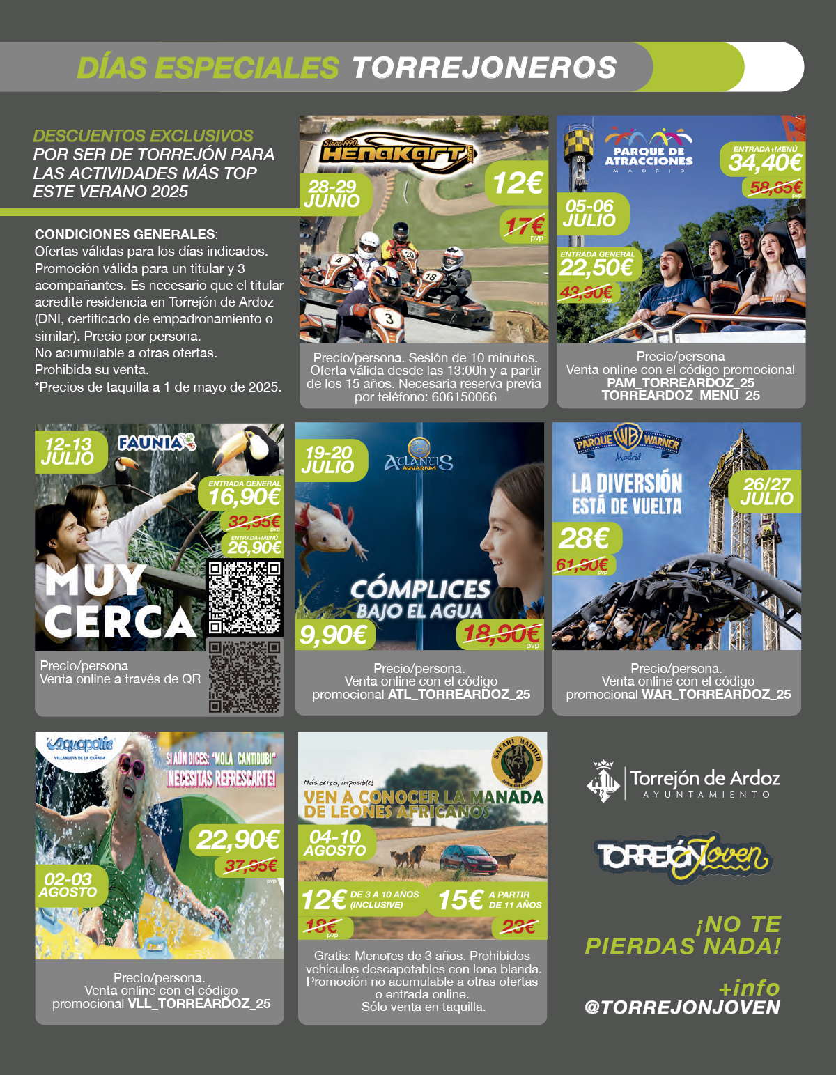 • Asimismo, los días 26 y 27 de julio, el Parque Warner se sumará a los descuentos para torrejoneros con la entrada por 28 euros por persona en vez de los 61,90 que cuesta. La venta será online a través de https://www.parquewarner.com introduciendo el código promocional WAR_TORREARDOZ_25