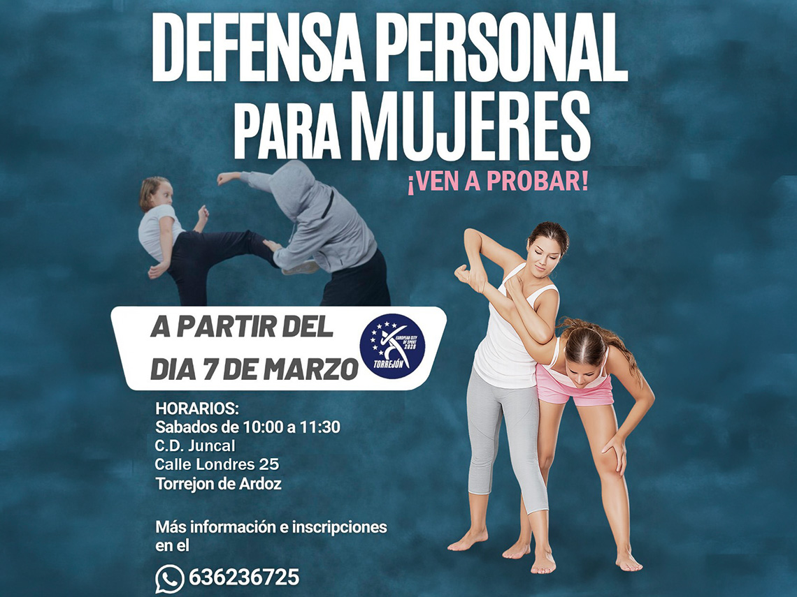 Por otra parte, este sábado también comenzará una nueva actividad en el CD El Juncal. Se trata de clases de defensa personal para mujeres que se desarrollarán de 10:00 a 11:30 horas todos los sábados. Estarán impartidas por José Manuel Ruiz, experto en defensa personal y técnico superior en actividades deportivas, entrenador del Club de Lucha Torrejón, cinturón negro 3 dan de judo, cinturón negro 1 dan de karate, con conocimientos de boxeo, jiu-jitsu y manejo de armas. Todas las mujeres que estén interesadas pueden recibir más información llamando al teléfono 636 236 725.