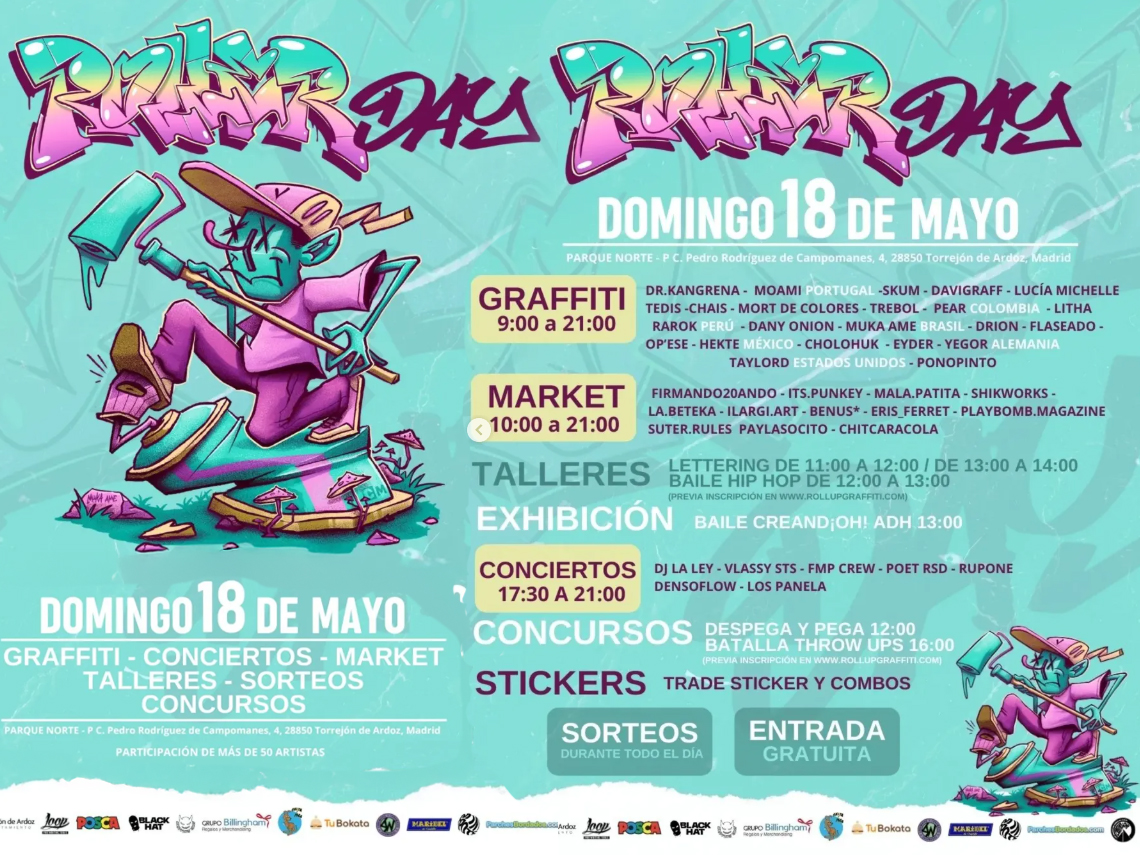 • Además, si eres fan del arte urbano y la cultura callejera, no te puedes perder el domingo, 18 de mayo, el “Roller Day”, un evento organizado por Roll Up Graffiti, en el que participarán más de 50 artistas, mostrando su creatividad y talento y dejando su huella en los muros del Parque Norte, que se transformará en una galería a cielo abierto. Además, habrá conciertos, exhibiciones de graffiti en vivo, actuaciones de baile, exposiciones de stickers, concursos, sorteos, talleres creativos o un market, entre otras iniciativas, que harán vivir al público una jornada llena de color, estilo y buena onda y que llega para demostrar que el arte urbano es mucho más que graffiti, es una forma de expresión y una visión del mundo a través del arte
