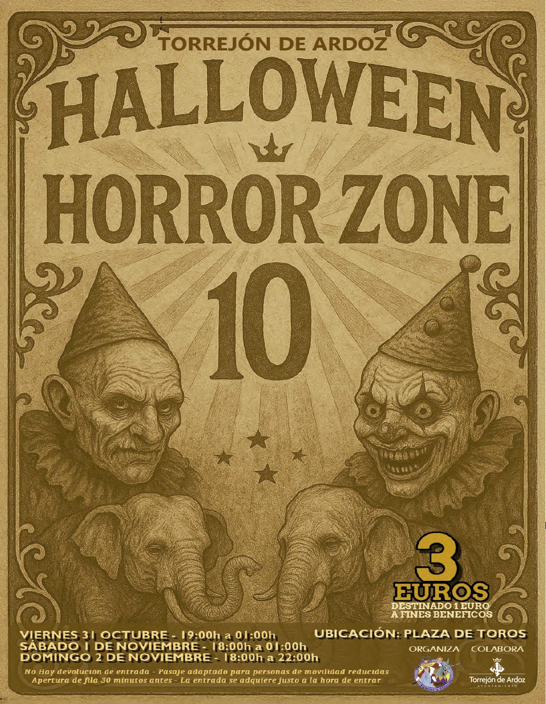 Halloween Horror Zone 10, el mayor pasaje de terror de la Comunidad de Madrid se confirma como una de las actividades más terroríficas y de mayor éxito de la región. Más de 6.000 personas visitaron los pasados viernes y sábado y ayer domingo la iniciativa, que este año contó con 25 actores y 18 salas tematizadas, novedosos decorados y efectos especiales de gran calidad, destacando además las actividades organizadas por los colegios, AMPAS, comunidades de vecinos y particulares. Organizado por la Comparsa de Gigantes y Cabezudos de Torrejón de Ardoz con motivo de Halloween y con la colaboración del Ayuntamiento, la temática de este año ha estado inspirada en un circo de 1940, con payasos, trapecistas, acróbatas y personal de acomodo que han hecho pasar a los miles de visitantes una de las experiencias más terroríficas de su vida.