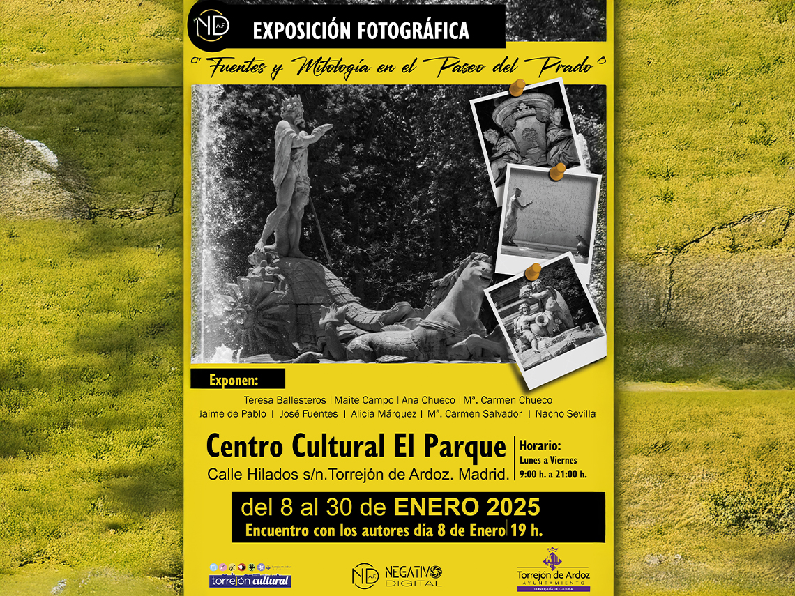 • Hasta el 30 de enero, el Centro Cultural El Parque recoge la exposición fotográfica “Fuentes y Mitología en el Paseo del Prado” de los autores Teresa Ballesteros, Maite Campo, Ana Chueco, Mª Carmen Cueco, Jaime de Pablo, José Fuentes, Alicia Márquez, Mª Carmen Salvador y Nacho Sevilla. El horario de visita es de lunes a viernes de 9:00 a 21:00 horas