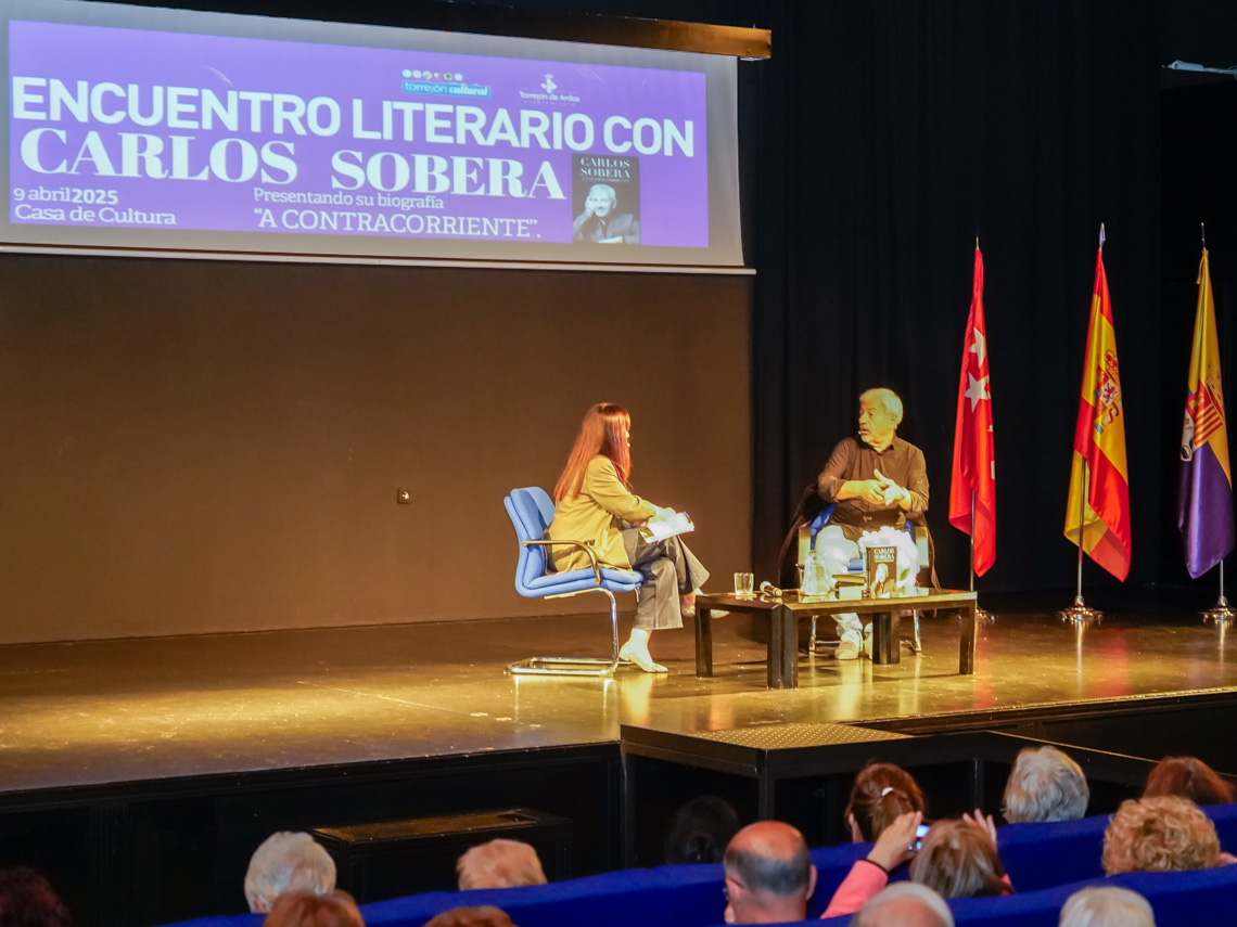 Torrejón de Ardoz, 7 de mayo de 2025. El pasado 9 de abril, la Casa de la Cultura también fue el escenario de otra de la iniciativa que contó con un gran respaldo de los torrejoneros como fue el Encuentro Literario con el carismático Carlos Sobera en el que dio a conocer su biografía “A contracorriente”. El reconocido presentador y actor, que ha dejado una huella imborrable en el mundo del entretenimiento, compartió con los asistentes su gran pasión por su profesión y su profunda conexión con la ciudad torrejonera. “He estado siempre muy ligado a esta ciudad y estoy encantado de estar aquí, un lugar que tiene un impulso cultural y vital extraordinarios. Algo que comprobé cuando vine a presentar las Mágicas Navidades, ya que soy embajador de la I Capital Europea de la Navidad. Además, he estado en este teatro varias veces, la última con la obra Inmaduros y cada vez que regreso, siento que estoy en casa”, destacó el también empresario teatral.