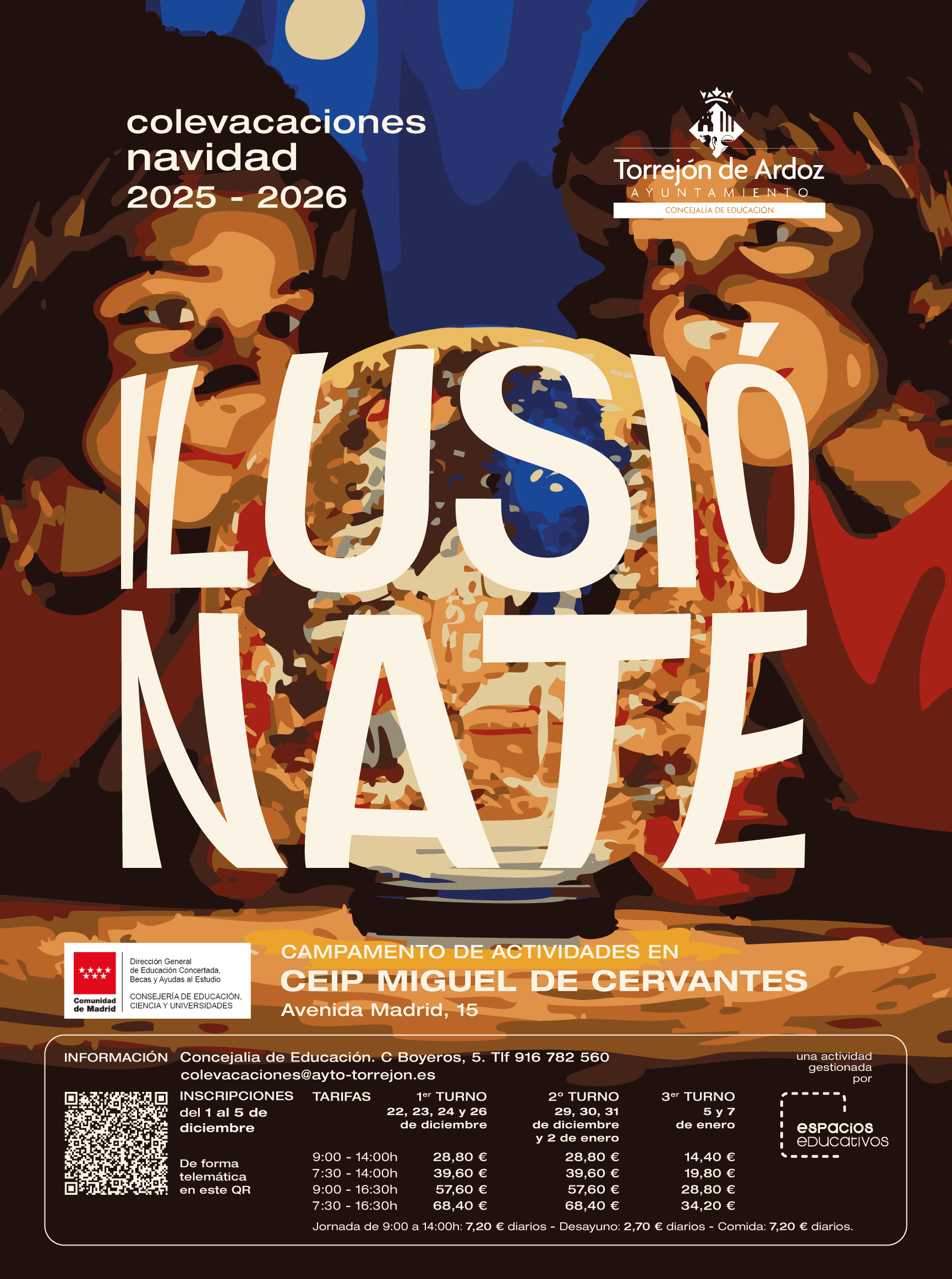 Esta iniciativa está dirigida a los niños de entre 3 y 12 años y se realizará en el CEIP Miguel de Cervantes, situado en la avenida Madrid, 15. Los interesados podrán realizar la inscripción hasta agotar plazas en el QR que aparece en el cartel y a través de este enlace https://n9.cl/z1o7s5. Para más información en la Concejalía de Educación (calle Boyeros, 5), en el teléfono 91 678 25 60 y en colevaciones@ayto-torrejon.es.