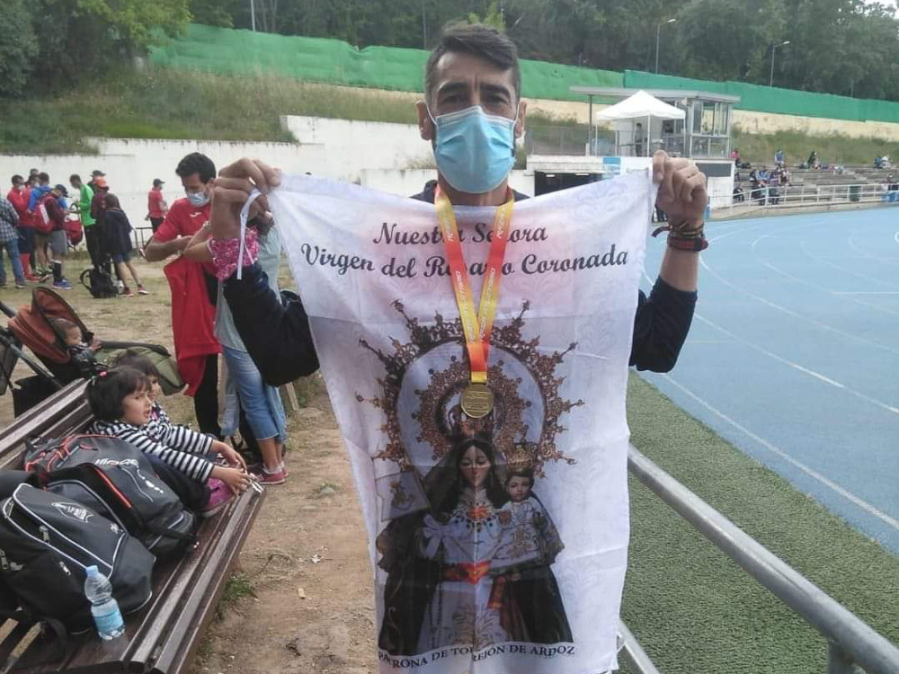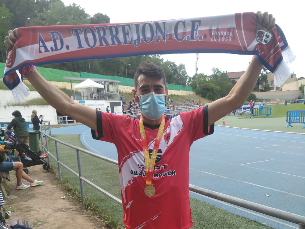 Torrejón de Ardoz, 24 de mayo de 2021. Juan José Crespo revalidó un título que ya había logrado en el año 2019 y, además, bajó en 7 segundos el anterior récord de España que él mismo poseía. Esta nueva medalla en un campeonato de primer nivel, que el atleta torrejonero ofreció a la patrona de la ciudad, la Virgen del Rosario ayer en el acto de conmemoración del 300 aniversario de la fundación de la Hermandad, sigue confirmando al deportista como uno de los mejores de su categoría.