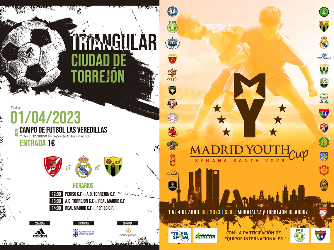 En lo referente a los torneos de fútbol base, mañana sábado, 1 de abril, el Campo de Fútbol Municipal Las Veredillas acogerá en “Triangular Ciudad de Torrejón” de categoría infantil, organizado por el exjugador del Real Madrid y campeón de Europa, Manolo Sanchís, con la participación del Real Madrid, AD Torrejón CF y Periso. El primer partido comenzará a las 12:00 horas entre el Periso y la AD Torrejón CF. A las 13:00 horas se disputará el encuentro entre la AD Torrejón CF y el Real Madrid y, por último, a las 14:00 horas se verán las caras el Real Madrid y el Periso.