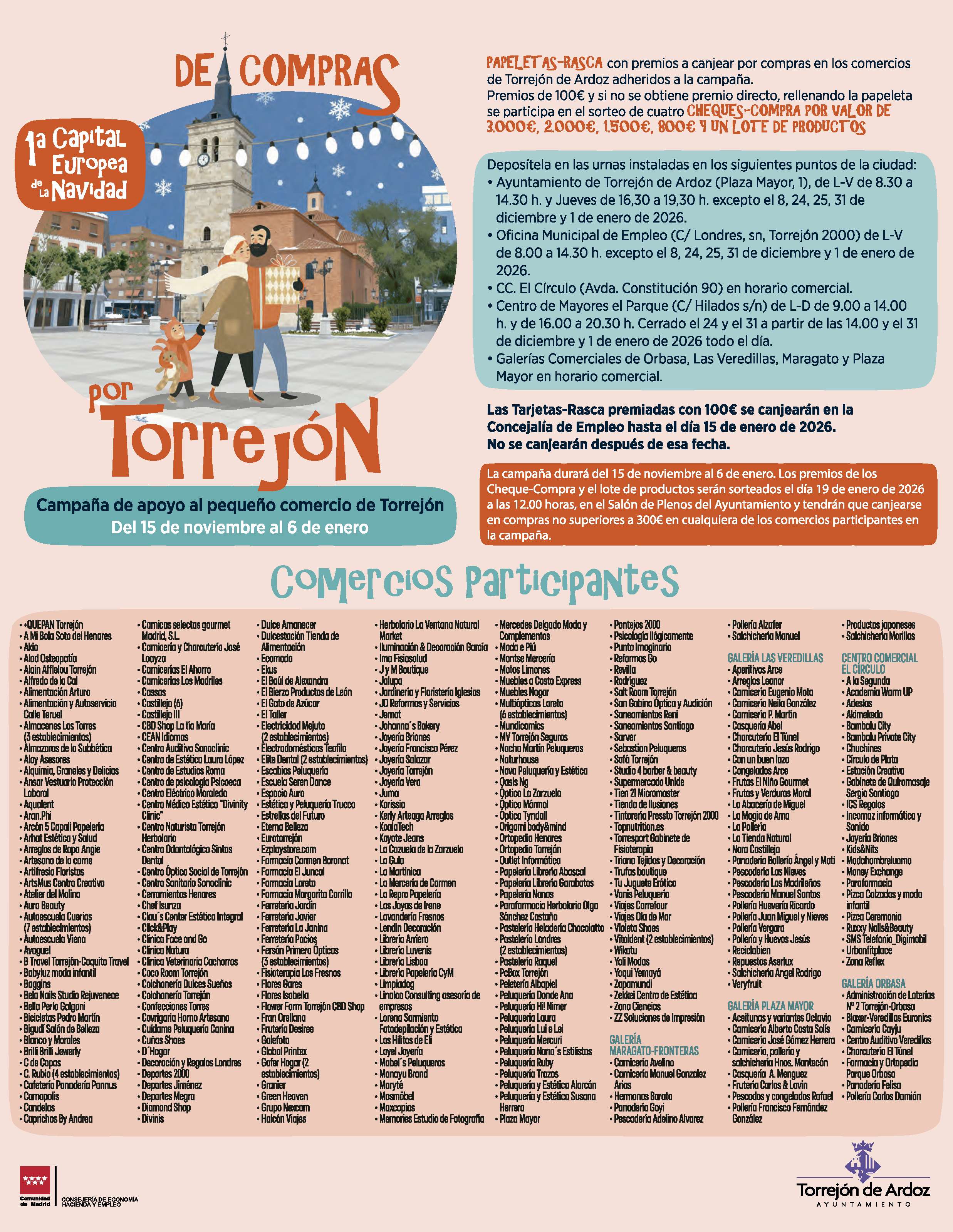 Torrejón de Ardoz, 5 de enero de 2026. En este sentido, a través de las Tarjetas Rasca, los clientes que realicen compras superiores a 20 euros podrán optar a premios directos de 100 euros a canjear en compras en un único comercio de los adheridos a la campaña a elegir por el premiado. Las Tarjetas Rasca premiadas se canjearán en la Concejalía de Empleo hasta el día 15 de enero de 2026. Hay un total de 2.000 euros en Tarjetas Rasca premiadas.