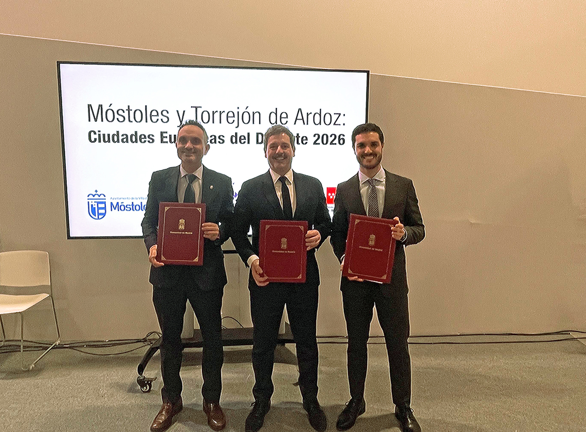 La Comunidad de Madrid, junto a los ayuntamientos de Torrejón de Ardoz y Móstoles, ha firmado un convenio de colaboración, apoyo e impulso de la promoción de actividades y eventos por el nombramiento de ambas como Ciudades Europeas del Deporte 2026, una distinción que han recibido las dos ciudades por parte de la Asociación Europea de Capitales y Ciudades del Deporte (ACES Europe), organismo reconocido por la Comisión Europea. El acto ha tenido lugar hoy, jueves, en el stand de la Comunidad de Madrid en FITUR, la Feria Internacional de Turismo más importante del mundo en donde también está presente Torrejón de Ardoz. La firma del acuerdo ha contado con la presencia del consejero de Cultura, Turismo y Deporte de la Comunidad de Madrid, Mariano de Paco, del alcalde de Torrejón de Ardoz, Alejandro Navarro, y del primer edil de Móstoles, Manuel Bautista.