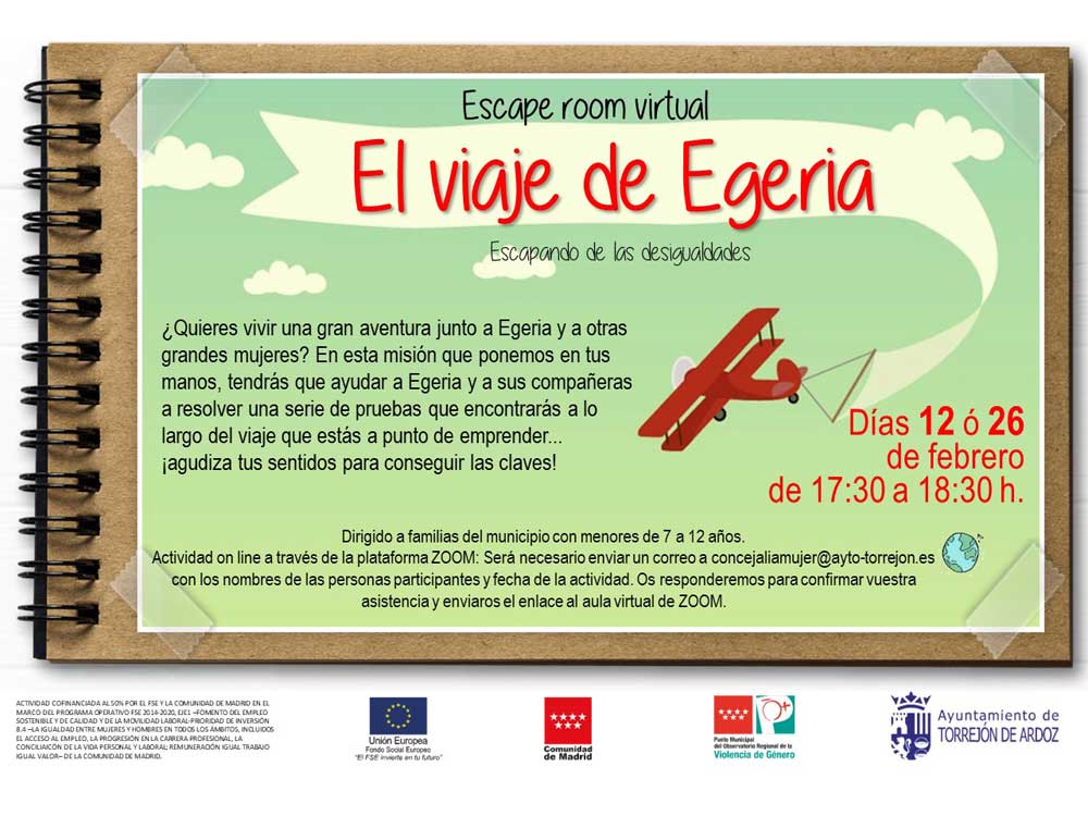 El Ayuntamiento de Torrejón de Ardoz, a través de su Concejalía de Mujer pone en marcha un viaje con el Escape Room virtual “El viaje de Egeria. Escapando de desigualdades”. Para formar parte de esta gran aventura, será necesario enviar un correo a concejaliamujer@ayto.torrejon.es con los nombres de las personas participantes y la fecha de la actividad, a elegir entre el 12 ó el 26 de febrero en horario de 17:00 a 18:30 horas.