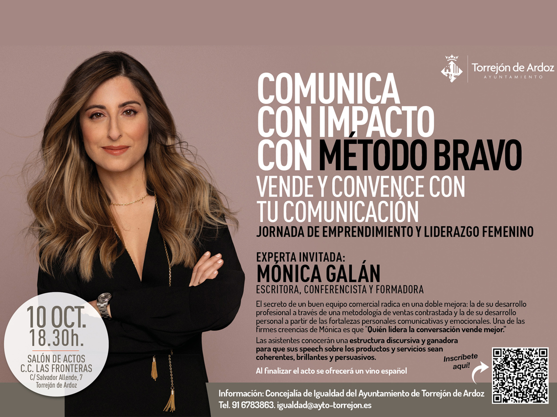 La escritora, conferencista y formadora, Mónica Galán, estará hoy, jueves, 10 de octubre, en Torrejón de Ardoz para impartir una conferencia bajo el título “Comunica con impacto con Método Bravo: Vende y convence con tu comunicación. Está destinada, principalmente, a mujeres empresarias y emprendedoras, aunque está abierta a todas las personas que tengan interés en el tema. Tendrá lugar a las 18:30 horas en el Salón de Actos del Centro Cultural Las Fronteras (C/Salvador Allende, 7) y la entrada es gratuita hasta completar aforo previa inscripción. Para inscribirse a la jornada hay que rellenar un formulario al que se puede acceder a través del siguiente enlace: https://n9.cl/inscripcion-monica-galan Más información, en la Concejalía de Igualdad, llamando al teléfono 91 678 38 63 y a través del correo electrónico igualdad@ayto-torrejon.es