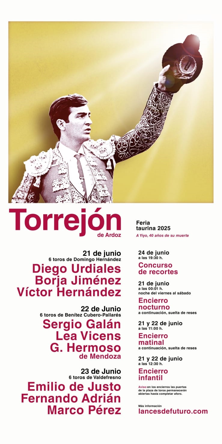 Torrejón de Ardoz, 10 de junio 2025. El primer festejo, el sábado 21 de junio a cargo de los matadores Borja Jiménez, 6ª en el escalafón nacional. Diego Urdiales, un diestro que destaca por su técnica y arte en la tauromaquia, y Víctor Hernández, con una reciente gran faena en la Feria de San Isidro, cortando una oreja en Las Ventas.