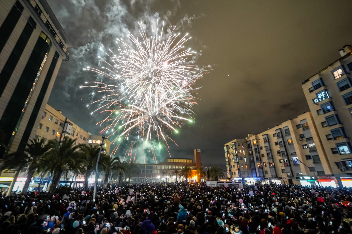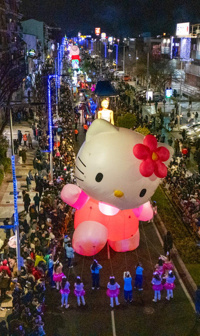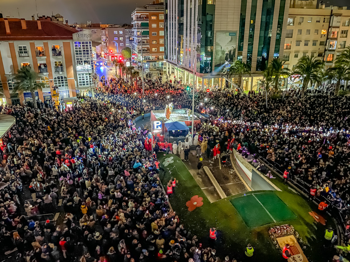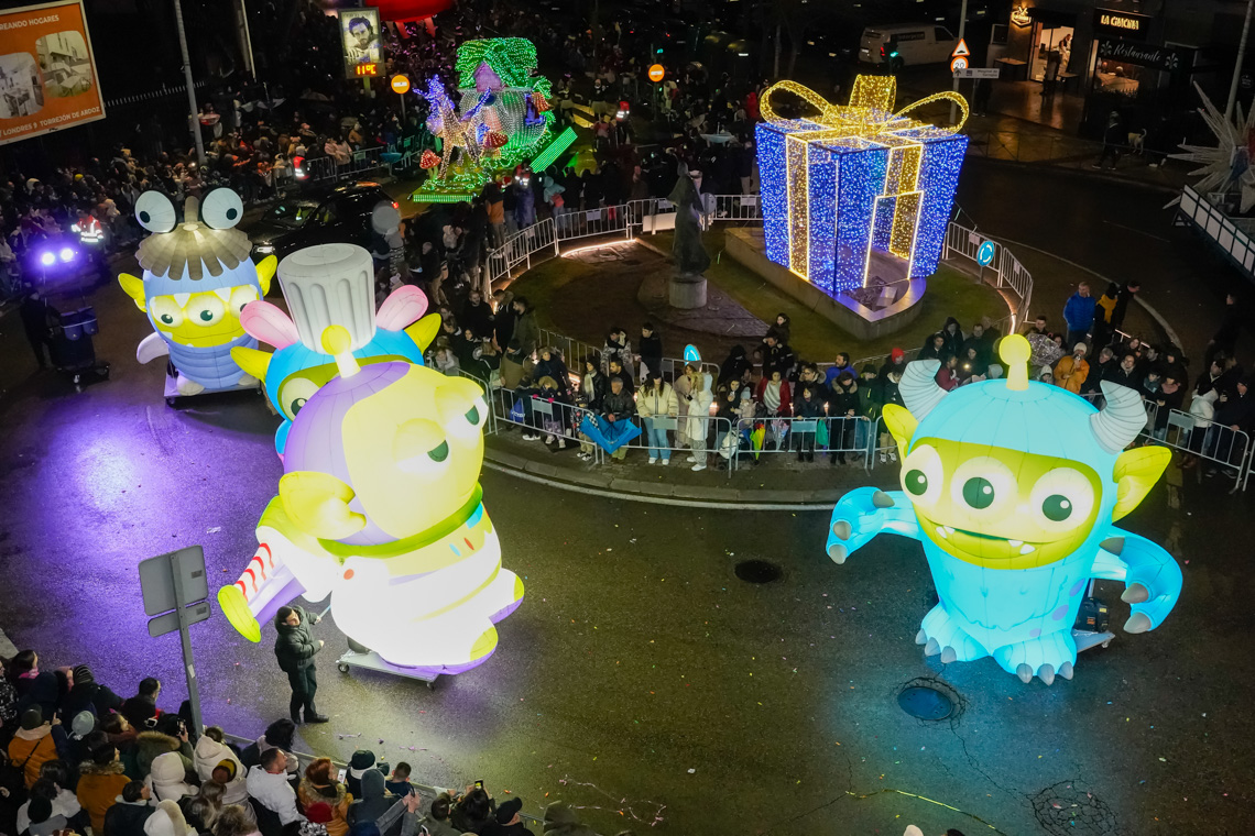 Torrejón de Ardoz, 7 de enero de 2025. Ante la dificultad que tenían los impresionantes globos de personajes infantiles de atravesar las calles estrechas que desembocan en la Plaza Mayor, el final de la Cabalgata se llevó a cabo en la Plaza de España con el saluda de los Reyes Magos y donde también tuvo lugar el Gran Espectáculo Final de Reyes.