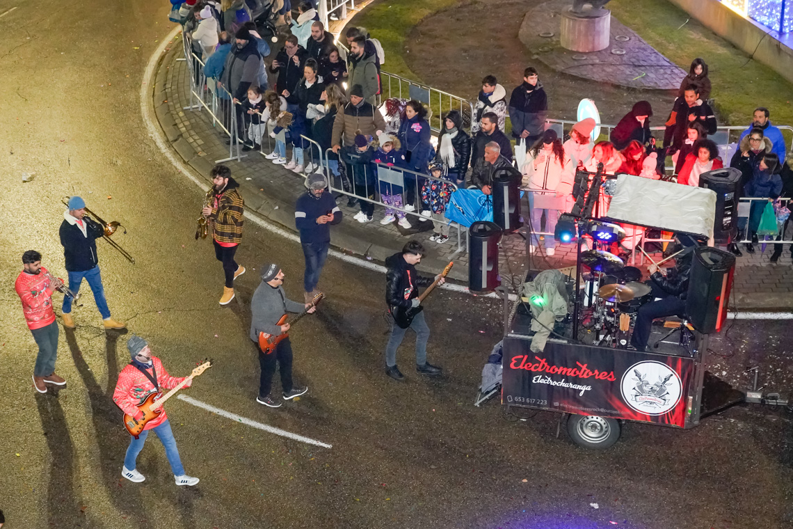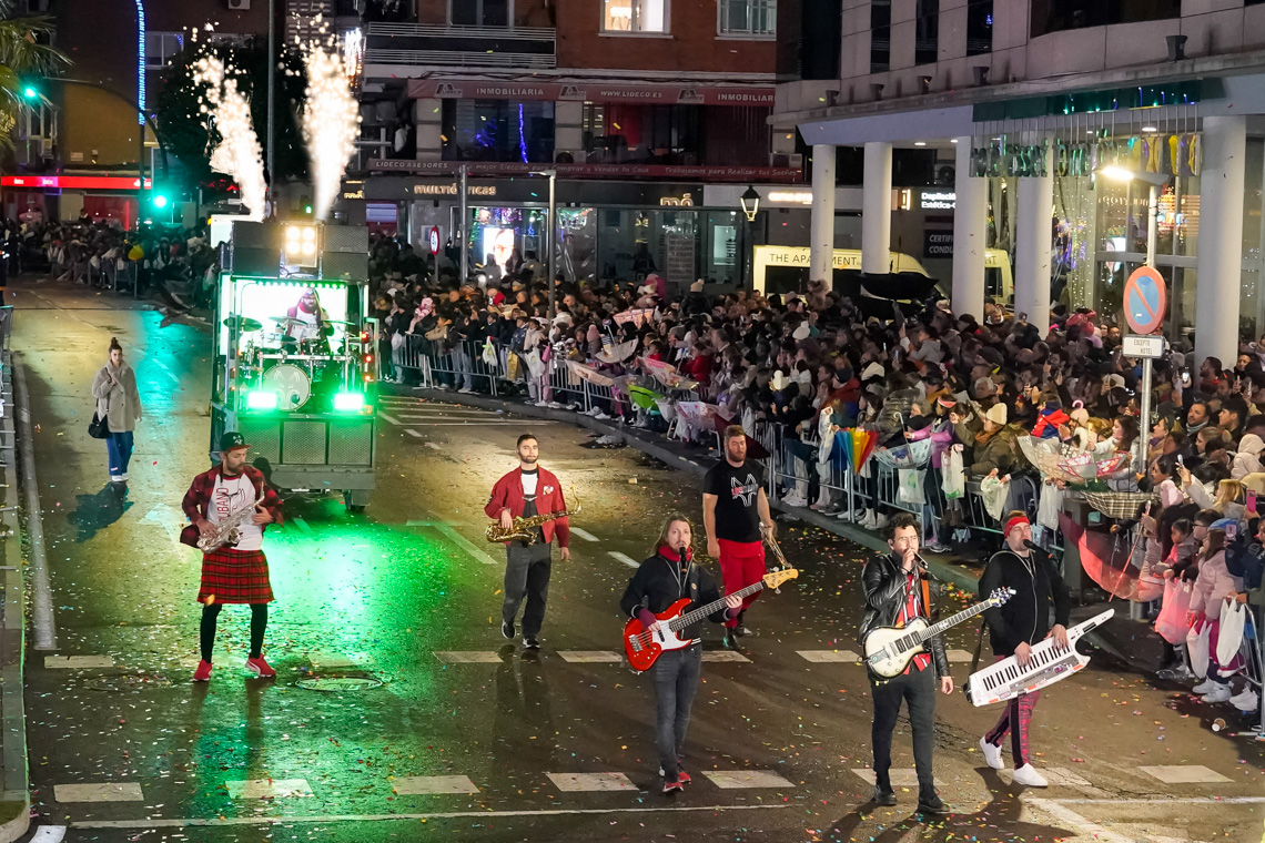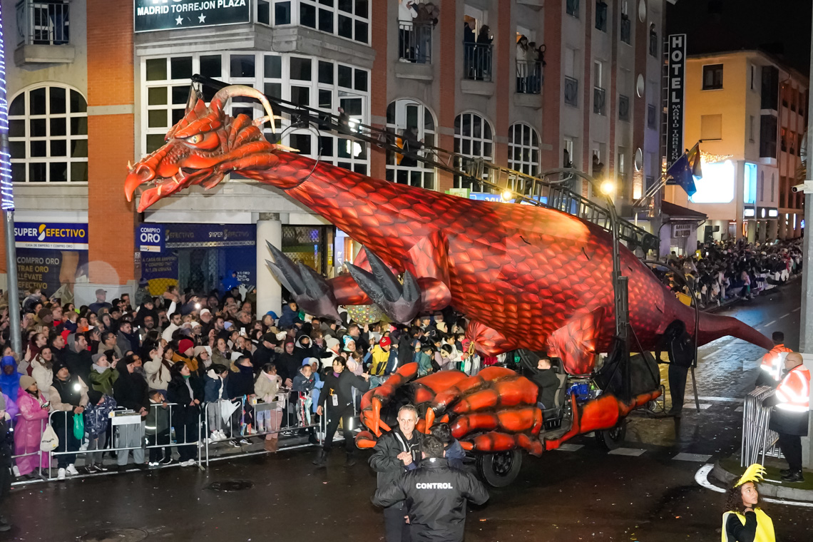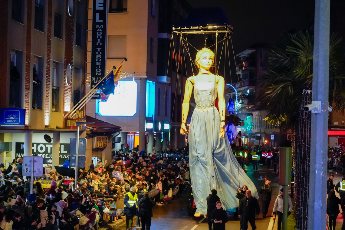 Este año, la comitiva contó con 13 originales carrozas de temática infantil con los personajes de animación más conocidos, los entrañables personajes navideños torrejoneros los Guachis, y las tres espectaculares de los Reyes Magos, acompañadas por un total de 21 pasacalles y elementos de animación, contando este año con numerosos elementos aéreos luminosos, todos ellos de las mejores compañías artísticas nacionales e internacionales, acompañados de nuestros Ángeles Navideños Gigantes.