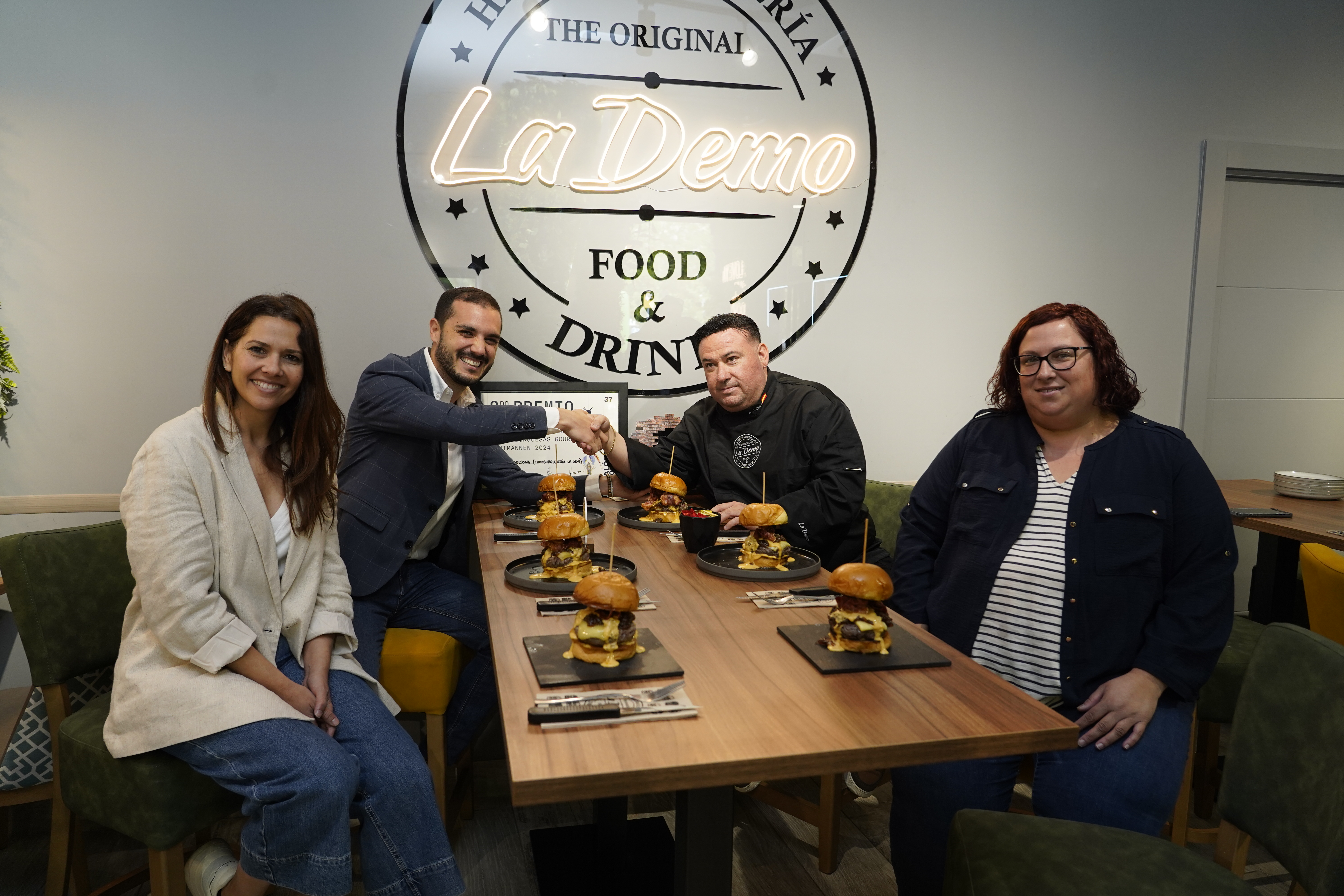 Torrejón de Ardoz, 29 de abril de 2024 La Hamburguesería torrejonera La Demo se lleva el segundo premio del concurso “Burger Combat”, con su hamburguesa “La Atrevida”, creación de Ángel Solsona. Una apuesta con la que La Demo participó en el concurso y que no dejó a nadie indiferente. Se trata de una hamburguesa gourmet elaborada con pan brioche, carne de vaca madurada, queso Gruyère, mermelada de tocino ibérico, panceta ibérica adobada crujiente y sala Millonaire casera, hecha a base de mango, curry, mayonesa, ketchup, mermelada de albaricoque, zumo de limón y pimienta negra.