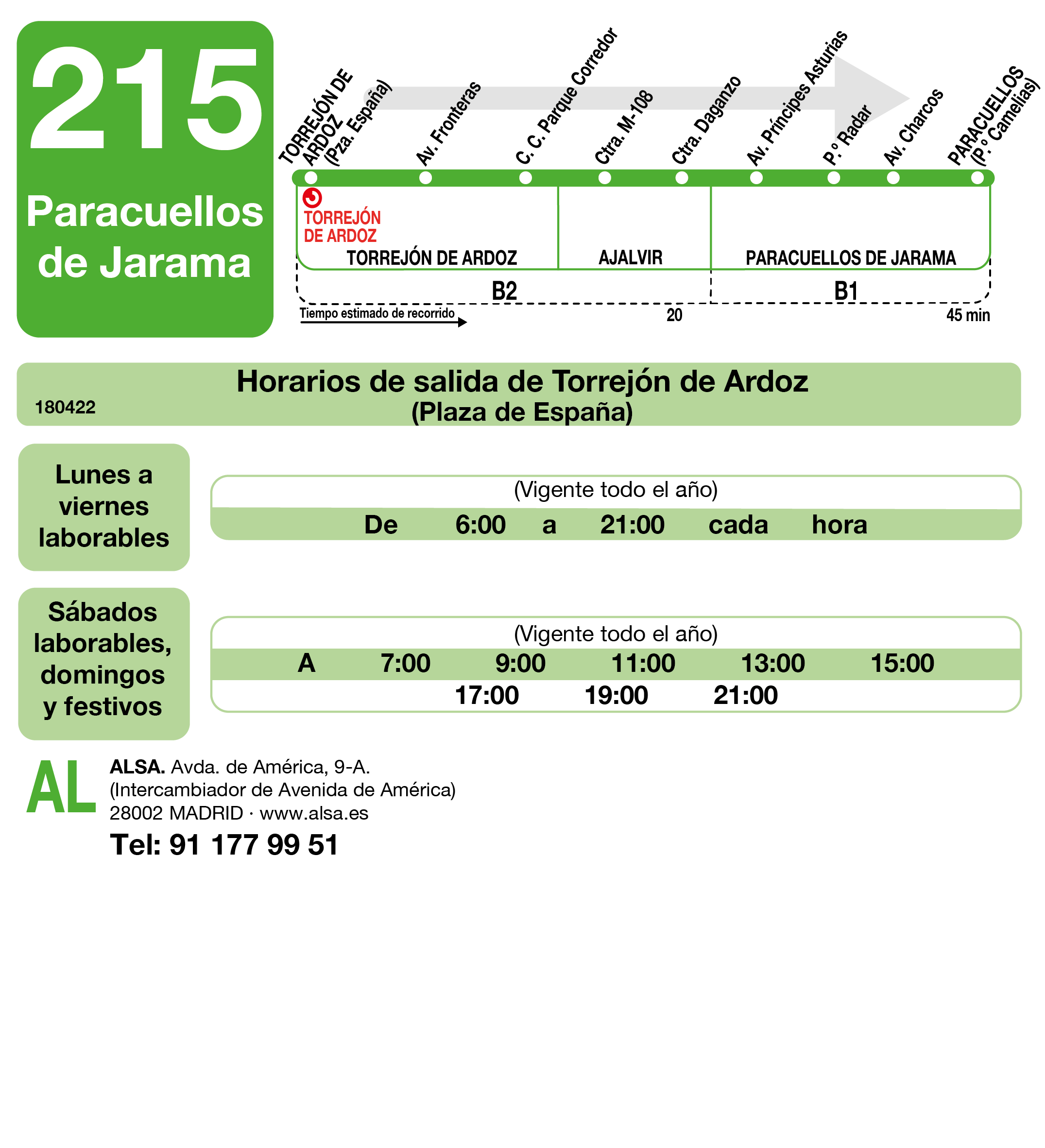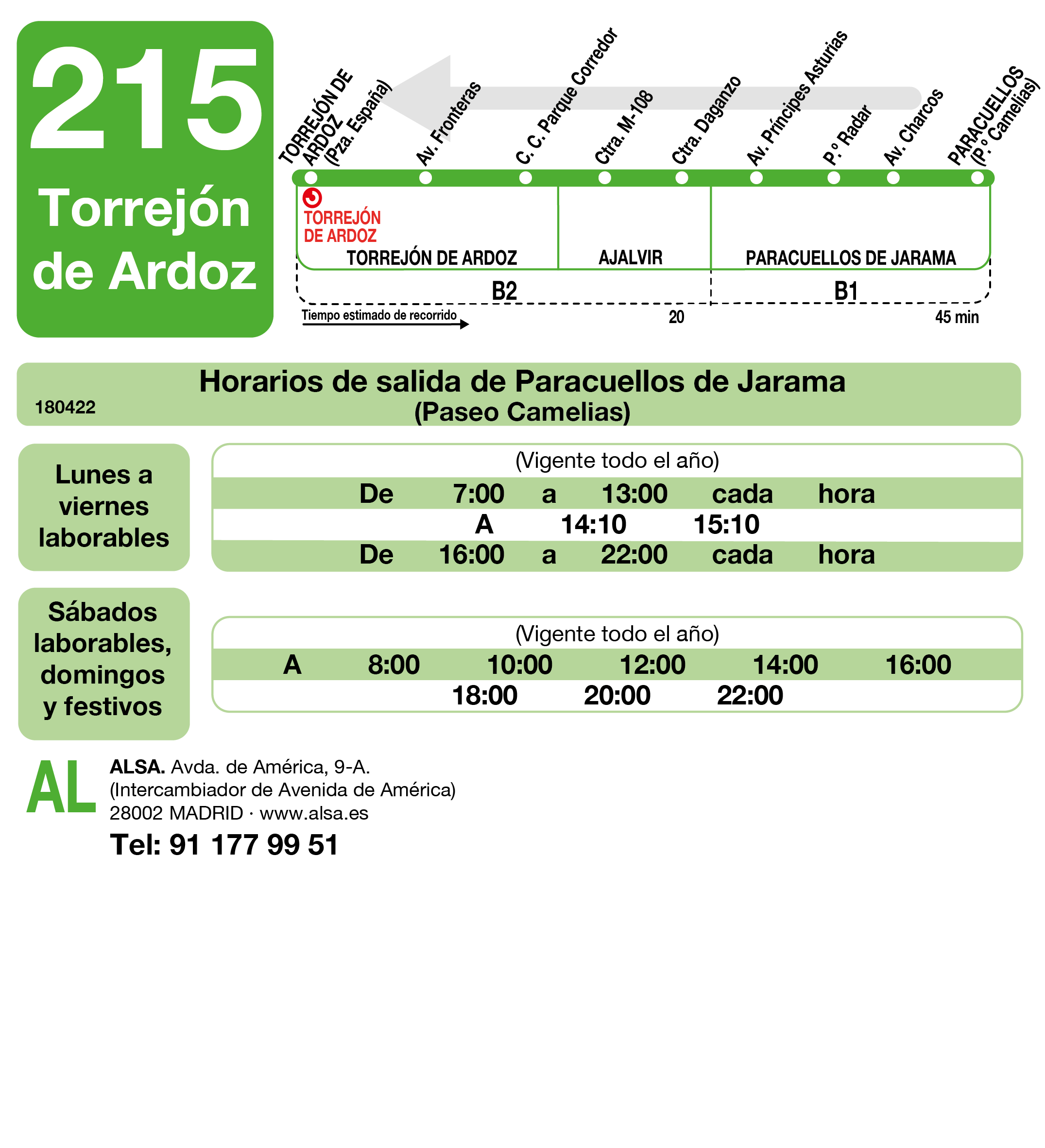 La Comunidad de Madrid, a través del Consorcio Regional de Transportes, ha ampliado desde el pasado 21 de agosto, con un viaje más en cada sentido, el horario nocturno de la línea de autobuses interurbanos 215, que conecta Torrejón de Ardoz con Paracuellos del Jarama, pasando por Ajalvir, sumando una población superior a los 160.000 habitantes. Una de las expediciones sale a las 23:00 horas desde la cabecera de Torrejón de Ardoz y la otra, a las 24:00 horas, parte de Paracuellos de Jarama.