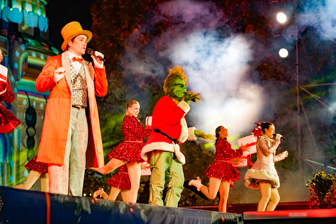 • El lugar más icónico del parque y la gran protagonista del recinto sigue siendo la Puerta Mágica, que cobra vida con un impresionante videomapping de 1.000 m². Sobre su fachada se proyecta un espectáculo visual y narrativo que nos traslada al universo mágico de Casca y Nueces, dos entrañables osos que nos guían por una historia encantada. Además, cada hora se presenta el espectáculo familiar El Secreto del Grinch, con música, baile y voces en directo.