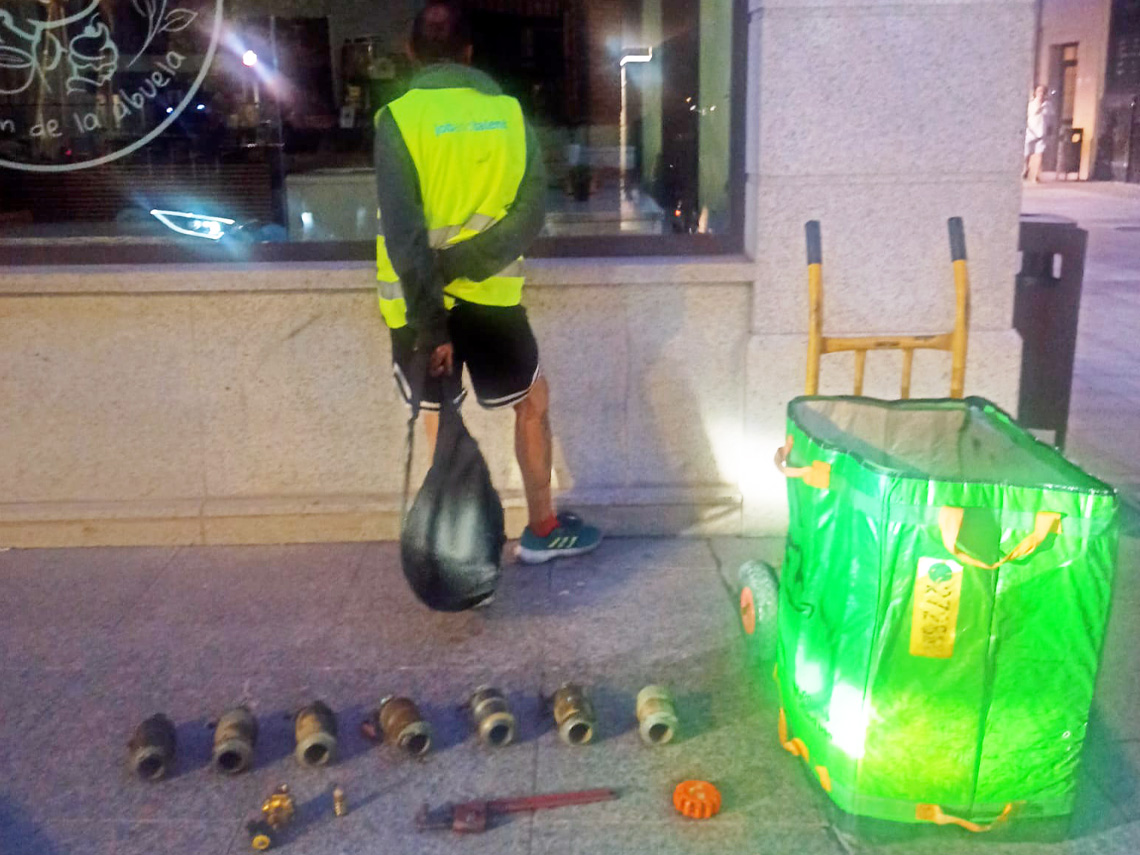 • Una patrulla se desplazó hasta el lugar, sorprendiendo al sujeto con 15 toberas que llevaba en un carro de reparto de paquetería, deteniendo al hombre, poniéndolo a disposición judicial y reintegrando las piezas sustraídas al Departamento de Obras.