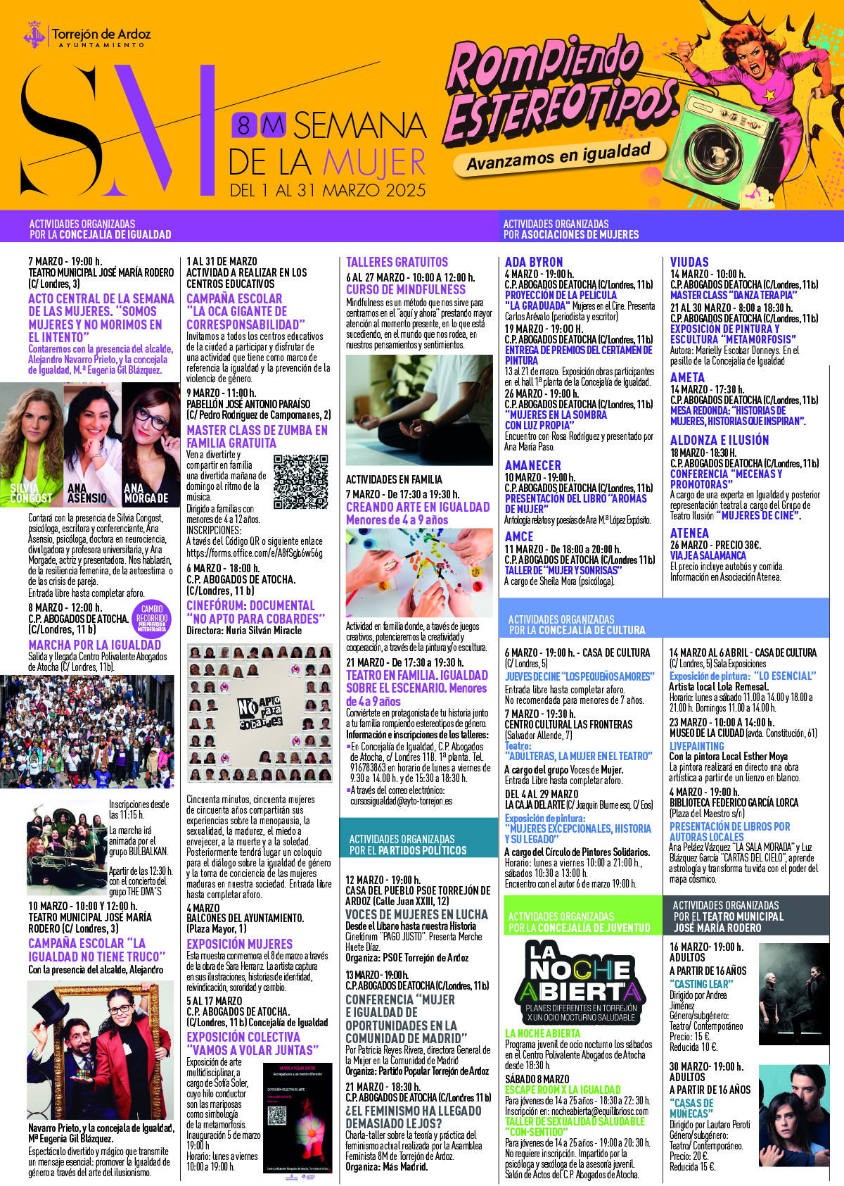 La Semana de la Mujer de Torrejón de Ardoz se celebra este año bajo el lema “Rompiendo estereotipos. Avanzamos en igualdad”. Para ello, el Ayuntamiento ha organizado un conjunto de actividades, que ponen el foco en la reflexión sobre la igualdad, la corresponsabilidad y la eliminación de los estereotipos de género como pilares fundamentales sobre los que debemos construir nuestras relaciones sociales y familiares. Una amplia programación, que tiene como objetivo contribuir a romper los estereotipos de género que limitan a las mujeres y perpetúan desigualdades.