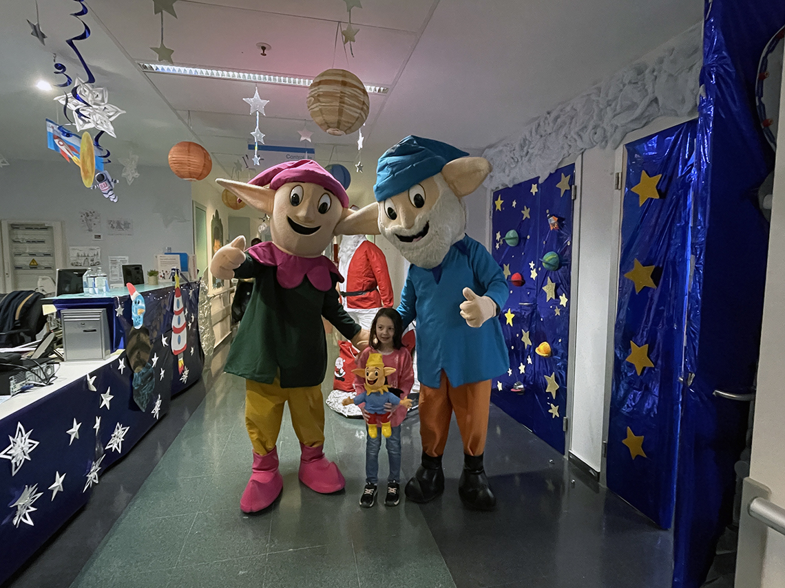 Torrejón de Ardoz, 23 de diciembre de 2025. Los Guachis han hecho un alto en las Mágicas Navidades para visitar a los niños que se encuentran ingresados en el Hospital Universitario de Torrejón de Ardoz. Así, estos entrañables personajes infantiles de las navidades torrejoneras, se han acercado hasta el centro sanitario torrejonero para repartir regalos, fotografiarse con los pequeños y sacar sonrisas a los niños y sus familiares, haciéndoles más agradable su estancia en el hospital en estas fechas tan señaladas y consiguiendo que se olviden por un momento de la patología que les mantiene ingresados en el centro.