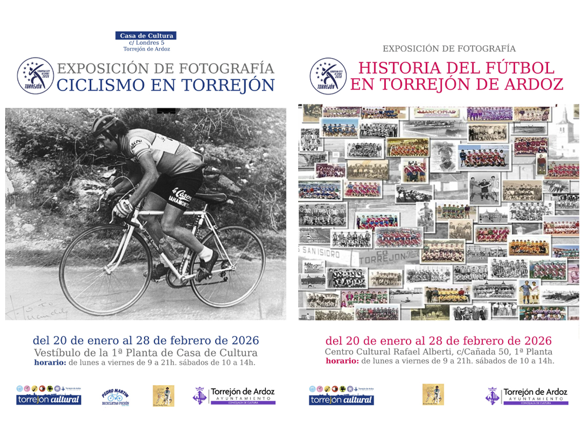 • Además, en el CC Rafael Alberti, situado en el barrio La Cañada, se puede ver hasta el 28 de febrero la exposición de fotografía “Historia del fútbol en Torrejón de Ardoz” y en el vestíbulo de la 1ª planta de la Casa de la Cultura “Ciclismo en Torrejón”, también hasta el 28 de febrero