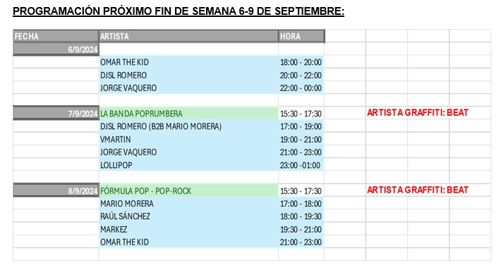 • Habrá una gran presencia y promoción de los artistas locales con actuaciones de grupos musicales de la ciudad, como La Banda Poprumbera, Formula Pop, o Letra pequeña, djs locales como Omar The Kid, Lollipop y Jorge Vaquero y un concurso para los grafiteros locales