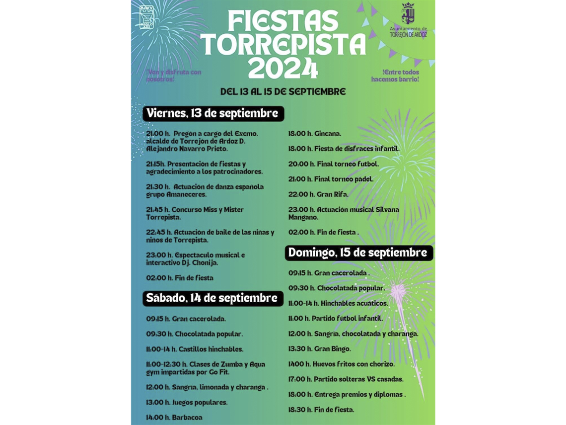 • Por su parte, los festejos del barrio de Torrespista tendrán el pregón a las 21:00 horas. A continuación, la actuación del grupo “Amaneceres”. Después el concurso de Miss y Mister Torrepista, para seguir con la actuación de los niños de Torrepista y el espectáculo musical e interactivo de Dj Chonija. Mañana sábado habrá cacerolada, chocolatada popular, castillos hinchables, clases de zumba y aquagym, sangría, limonada y charanga, juegos populares y barbacoa. También se podrá disfrutar de una gincana, fiesta de disfraces infantil, las finales de los torneos de fútbol y pádel, una gran rifa y la actuación musical de Silvana Mangano. El domingo volverá a haber cacerolada, chocolatada popular, sangría, limonada y charanga e hinchables acuáticos. Además, se podrá disfrutar de un gran bingo, de huevos fritos con chorizo y de los partidos de fútbol infantil y solteras contra casadas, para terminar con la entrega de premios y diplomas